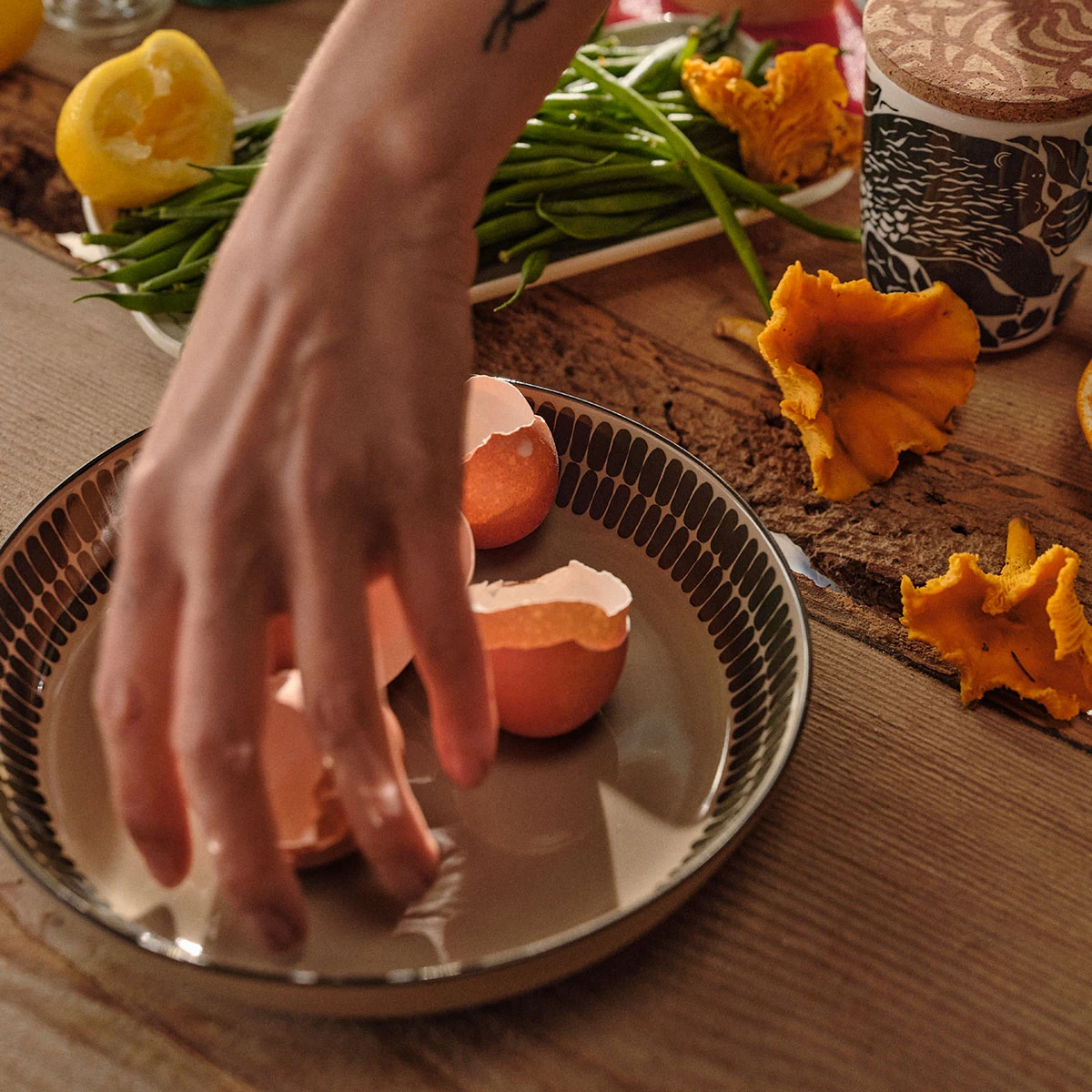 Marimekko’s prints have the ability to merge modern and retro in a timeless way. Called Alku (beginning), this Marimekko pasta bowl depicts the seeds from which the flowers of Marimekko’s bold floral designs grow. Designed by Maija Louekari, Marimekko Alku is featured on a pasta bowl, perfect for serving your favorite meals. The brown stoneware is microwave, oven-freezer, and dishwasher-safe so it can be used to store and warm foods and being dishwasher-safe just adds to the convenience.