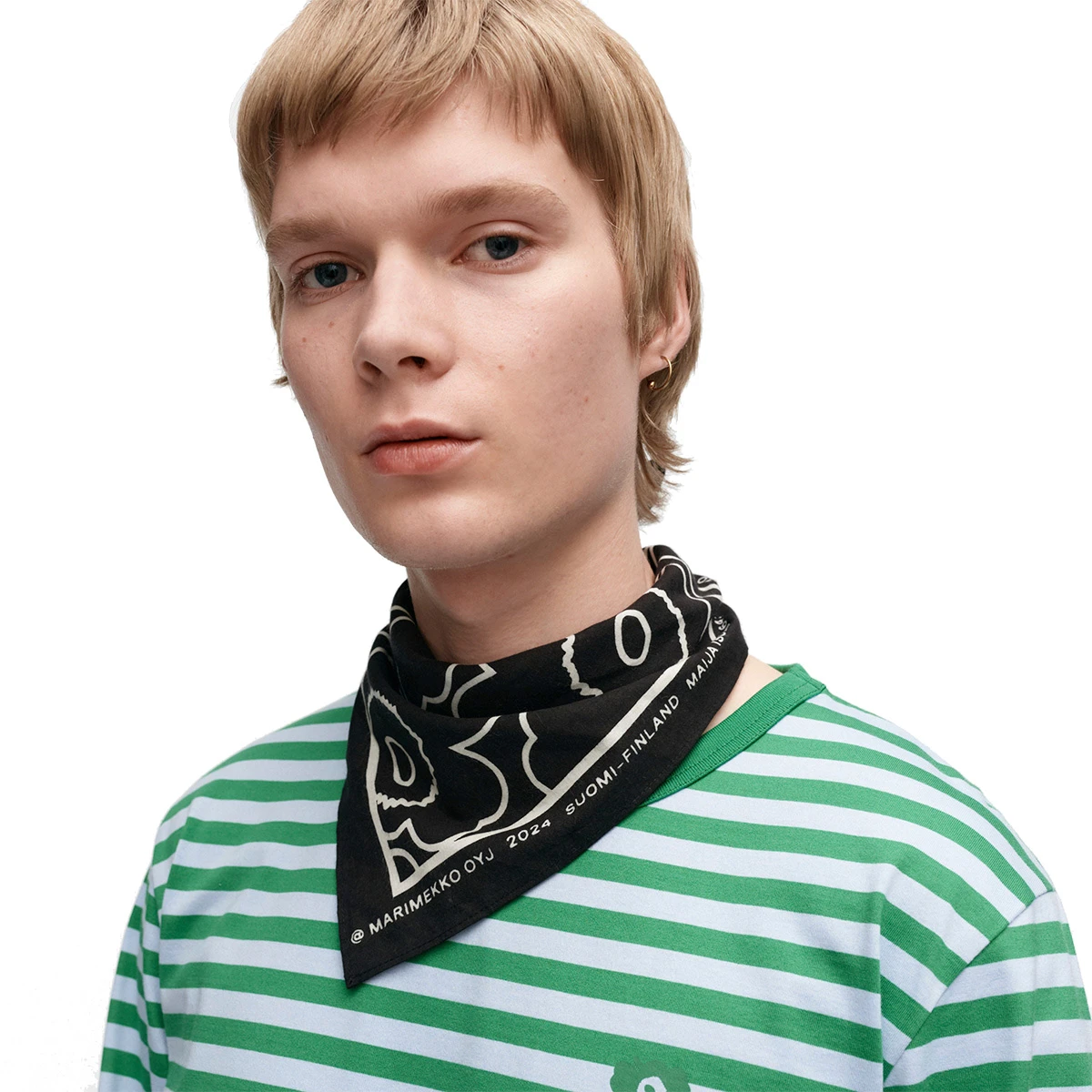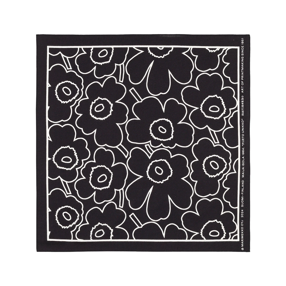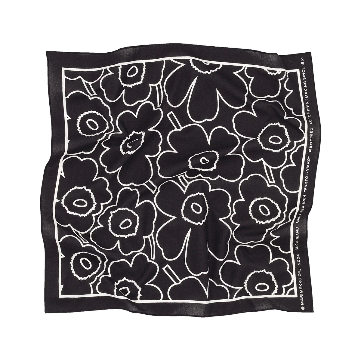 Piirto Unikko is a stylized and minimalistic variation of the beloved floral print created by Maija Isola in 1964. Traced with white poppies that sit atop a crisp black backdrop, the Marimekko Astrilli scarf is just neutral enough to pair with any ensemble while remaining bold with its graphic blooms. The versatile square shape allows you to wear it bandana-style, around your neck, or tied around the handle of a purse for a decorative touch. A border runs along the inside of the scarf with the Marimekko print text along the edges.