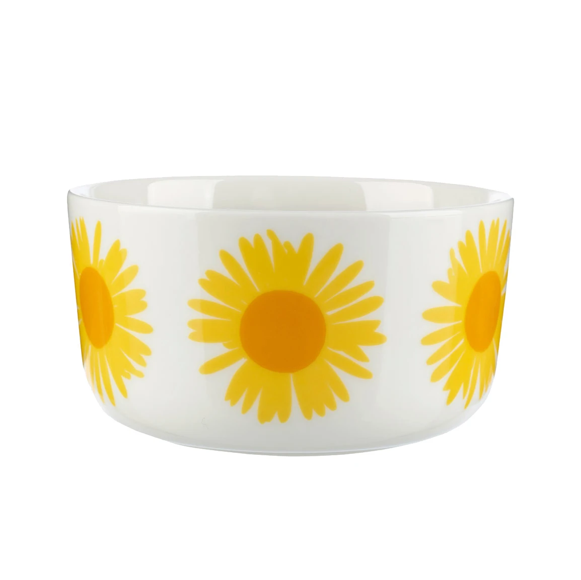Enjoy your favorite cereal, soups, or snacks with this playful and flowery Marimekko bowl. Maija Isola’s vibrant Auringonkukka (sunflower) pattern decorates this bowl, adding style to the simplicities of everyday dishware. This Marimekko Auringonkukka bowl is dishwasher, oven, microwave, and freezer safe for all your needs, and the white stoneware ensures long lasting use.