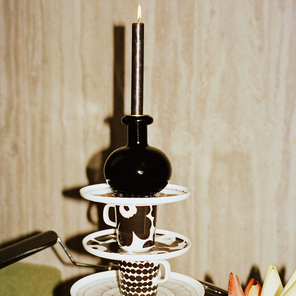 The Marimekko Butticula Candle Holder was designed by Carina Seth Andersson and is made from mouth-blown glass. Its neutral shade of black gives the opportunity to place different colored tapers inside, but it also looks stunning a stand alone piece of decor. The solid black exterior is polished and shiny, bringing an effortless elegance when placed upon a mantel, lining a dining table, or atop a windowsill. The metal top can be removed, and the glass becomes a vase for small stems and sprigs.
