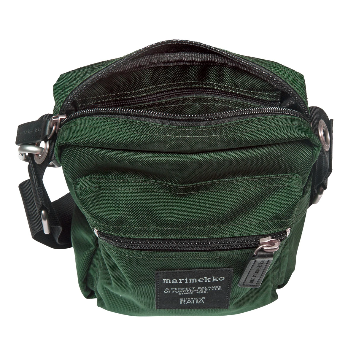 Travel and trail blaze with ease with the Marimekko Cash & Carry Bag in dark green. Equipped with side pockets, front zipper closure and interior pockets with zipper closure, all of your items will be safe and secure in this durable and versatile bag. The adjustable strap allows for ultimate comfort and the attached carabiner allows for added cargo.