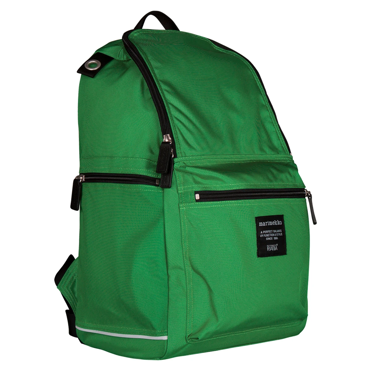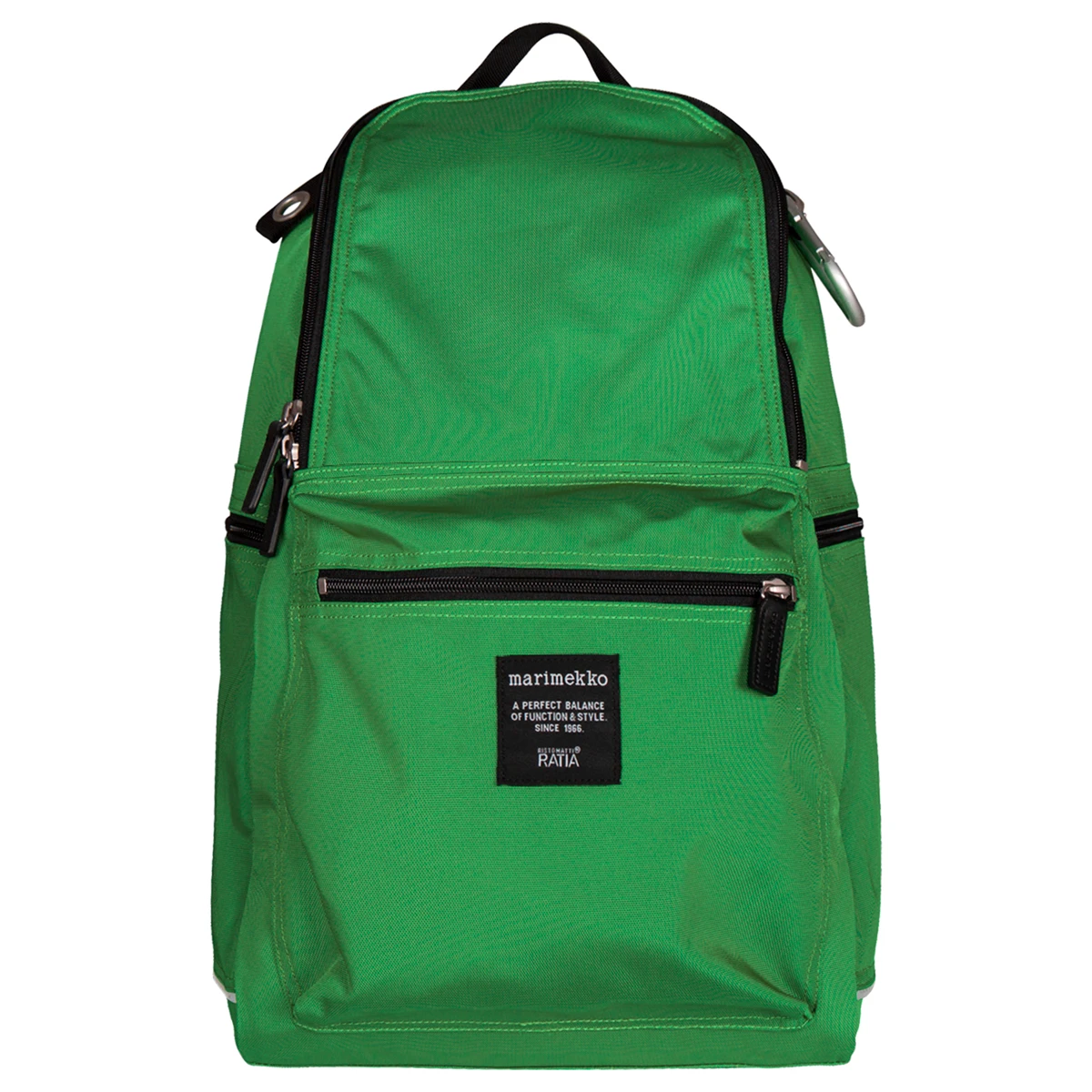 Your new practical pal, the Marimekko Buddy Backpack has a classic look and all the essentials to accommodate your needs. Made from durable 100% nylon with a reinforced bottom, this backpack is able to withstand heavy use rain or shine. Adjustable shoulder straps and back panel padding ensure the upmost comfort, and two built in grommets (one with a complimentary carabiner attached) are additional convenient features. Boasting four pockets total, the Buddy has a large main compartment with an inner mesh zippered pouch, a separate lower front pocket, and two deep, narrow compartments along either side for easily accessible storage. As the woven tag promises, the Marimekko Buddy Backpack is truly a stylish and multi-functional friend for you to take with you on any adventure. The green hue is fresh for summer and festive for winter – and lovely for in-between, too.