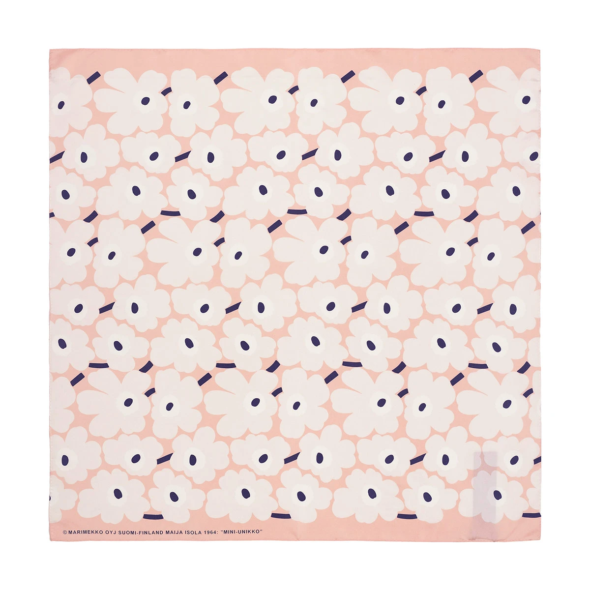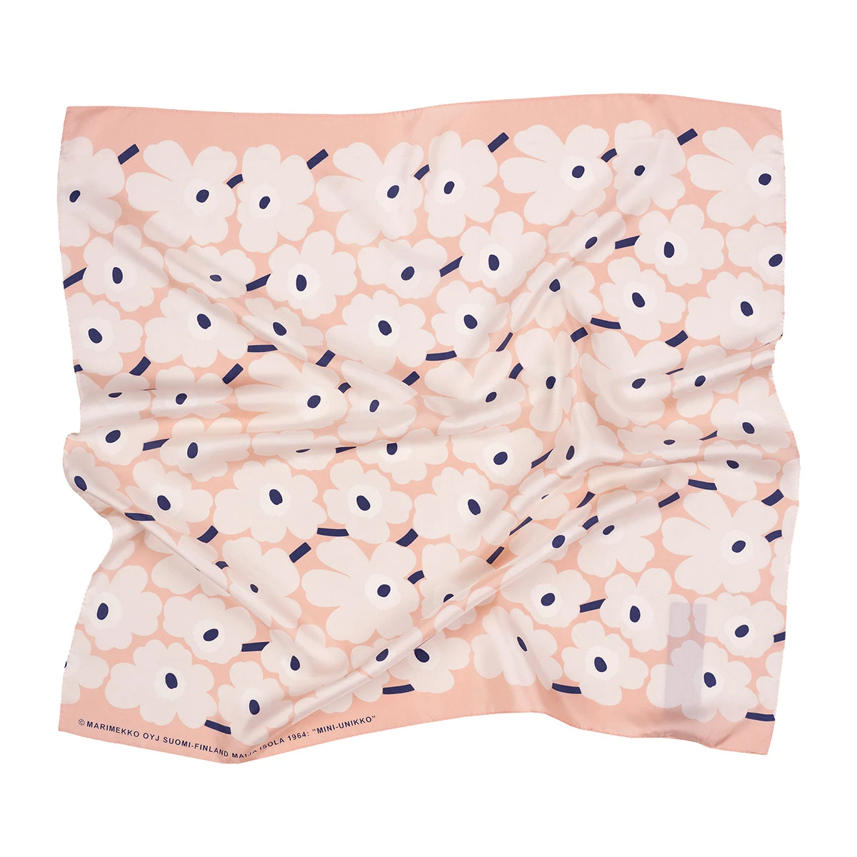 The 1960’s Unikko (Poppy) design is perfect for a classic silk scarf. The Marimekko Ihastus Mini Unikko scarf is adorned with a modern take on Maija Isola’s famous Unikko print, in smaller scale. An soft peach (with a hint of pink) combined with white and subtle grey gives this scarf a beautiful look. The square scarf can be tied around your neck, hair, or the handle of a purse for a showcase of the print.