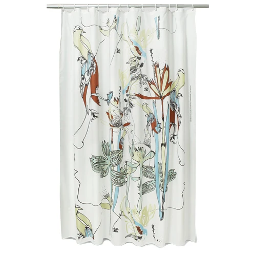 The profile of a woman’s face amongst blooming, tropical wildlife; the Iso Satakieli pattern is a result of dreamlike drawings by Maija Louekari. A shower curtain presents an opportunity to make a statement in the form of functional art, and this Marimekko print is an artistic and practical choice. Made from 100% cotton, the quality curtain will last as long as your love for this imaginative design.One might interpret that the images are the thoughts and memories inside her head. This polyester shower curtain is white with an accent cast of pastel greens and blues, as well as a rustic brown color. Add some artistic design flare to your bathroom with the Marimekko Iso Satakieli shower curtain.