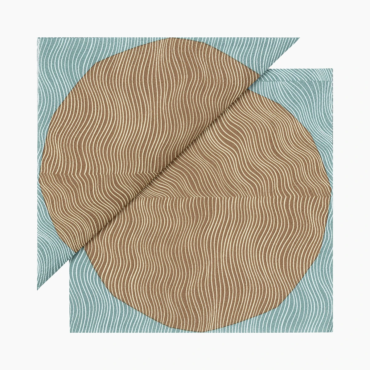 The Isot kivet Näkki print is a beautiful fusion of two Maija Isola designs from different decades. This contemporary design explores how large circular surfaces can create a sophisticated dialogue with a dense striped rhythm. The brown and deep turquoise coloring mixed with white curvy lines makes an earthy and modern design that will elevate your dining experience. The Marimekko lunch napkin is printed with non-toxic, water-based colors on recycled paper. These 100% biodegradable napkins make for a stylish and eco-friendly way to enjoy the convenience of disposable napkins.