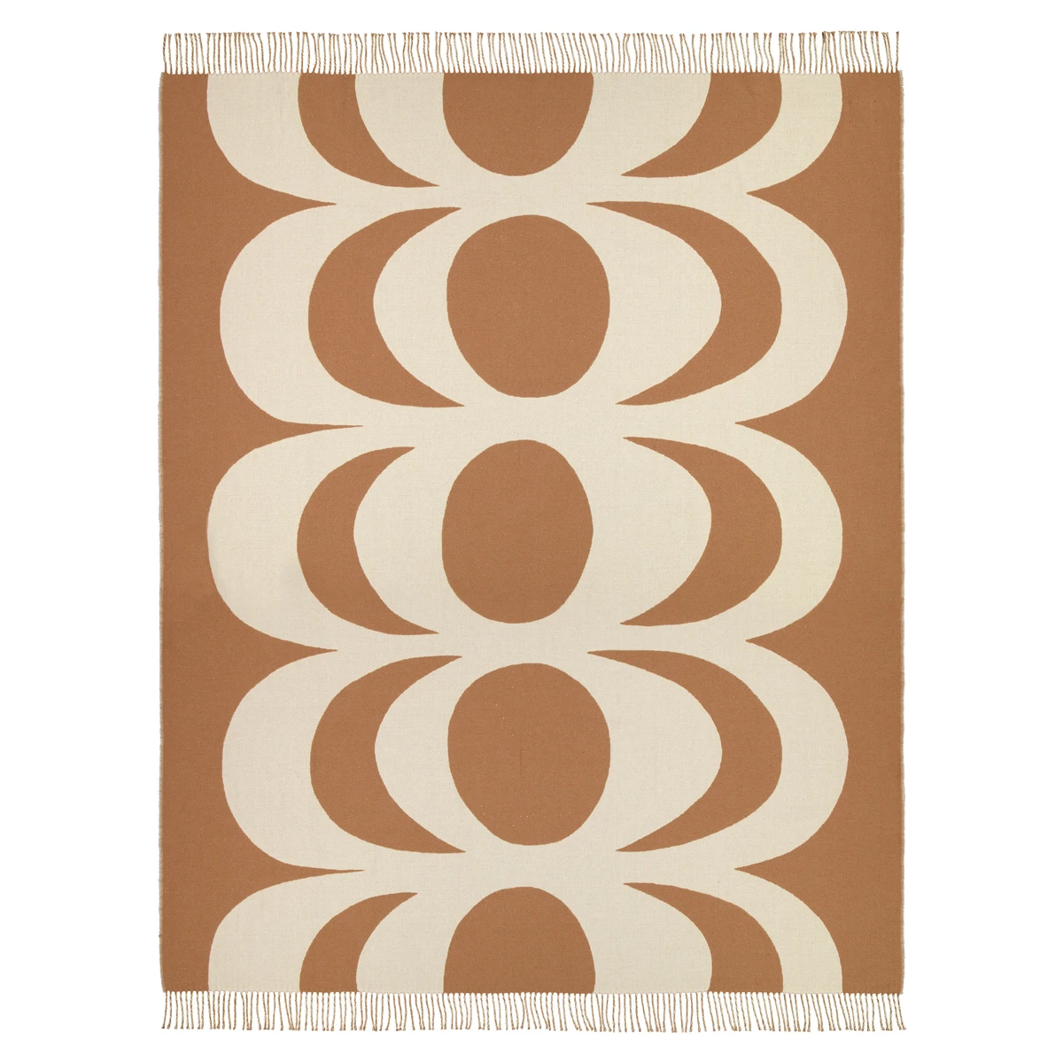Once upon a time, Maija Isola dropped her pail down a well and was inspired by the ripple effect to create her 1964 Kaivo (Well) pattern; half a century later, the bold design is still making waves worldwide. Here, it’s featured in soft and warm shades of cream and beige on a wool-blend blanket. The same pattern in the opposite colorway can be seen on the reverse side, so it looks fabulous however it’s folded or draped across a sofa back or bed. The fringed edges add to the cozy look and feel.