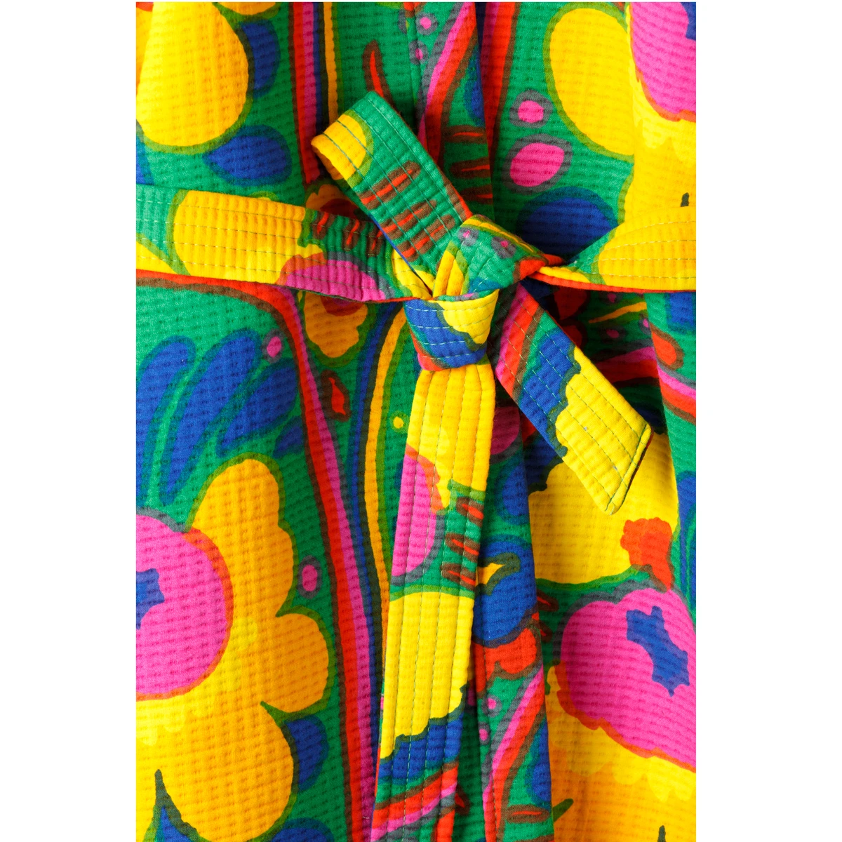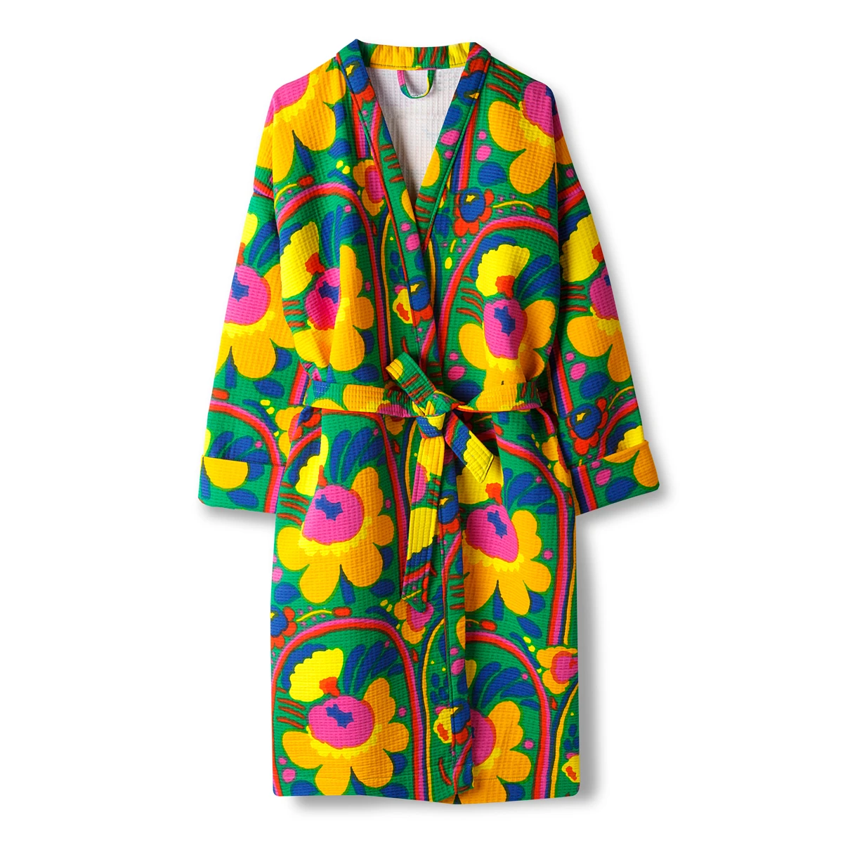 Wrap up in vibrant vintage style with the Marimekko Karuselli Solana Beach Robe. Katsuji Wakisaka’s 1973 Karuselli (Carousel) pattern saturates this soft 100% cotton robe. Roll up the cuffs and tie the belt to get the perfect relaxed fit. Deep pockets let you carry a loofah, sunscreen, or water bottle with you. The waffled texture and knee length will keep you comfortable after a sauna, on sandy beach walk, or while you relax at home.Small Measurements: