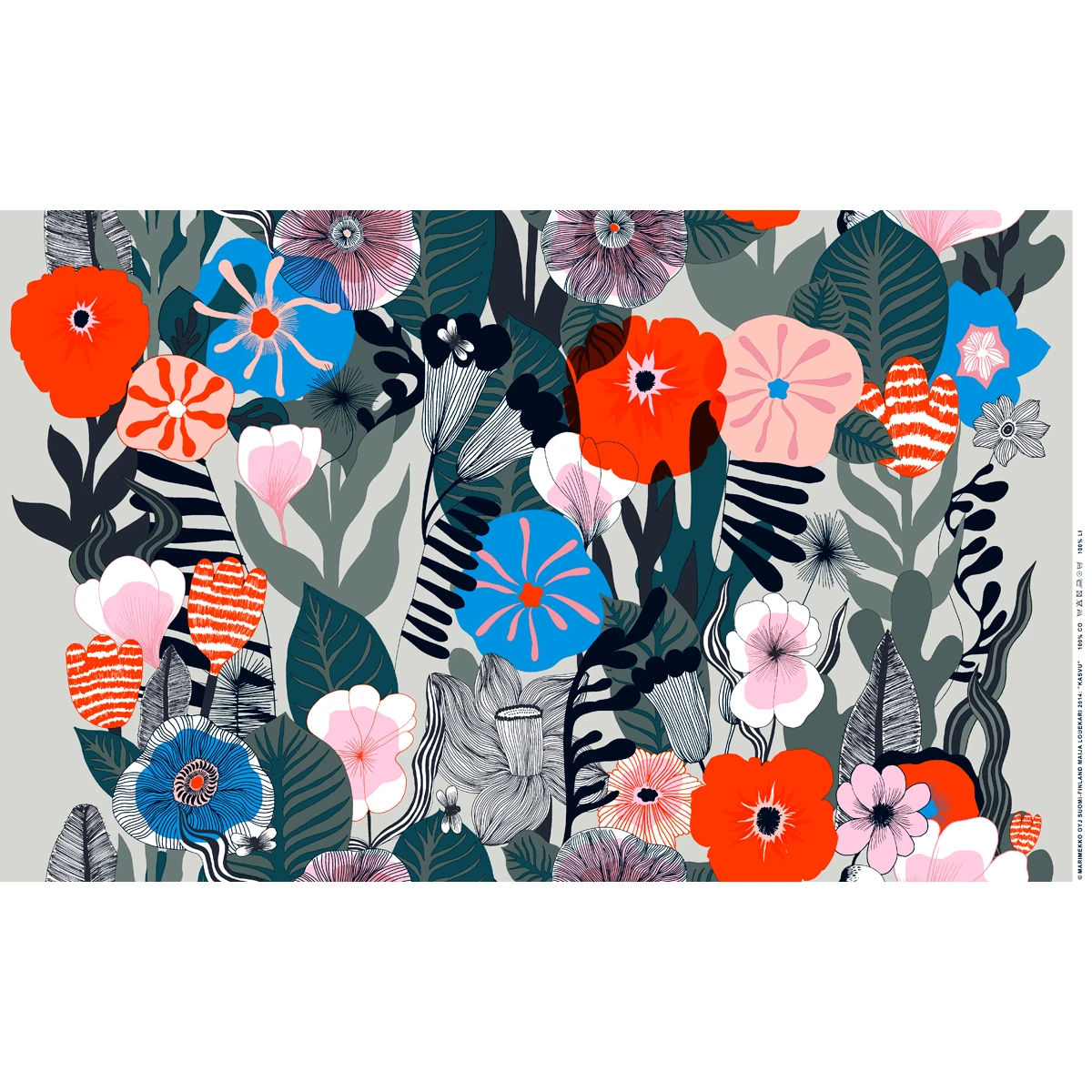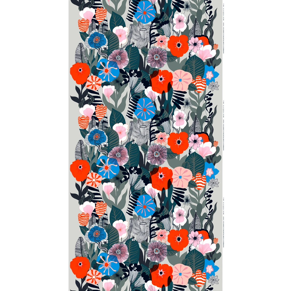 The Marimekko Kasvu (Growth) Multi PVC Fabric is contemporary in vibrant hues of grey, pink, red, green and blue. Maija Louekari achieves rich dimension with layers of flowers, leaves, and other organic shapes in the modern floral scene. Made of 100% PVC-coated cotton and printed in Finland, the easily cleaned fabric is perfect for tablecloths, placemats, and a variety of home decor projects.