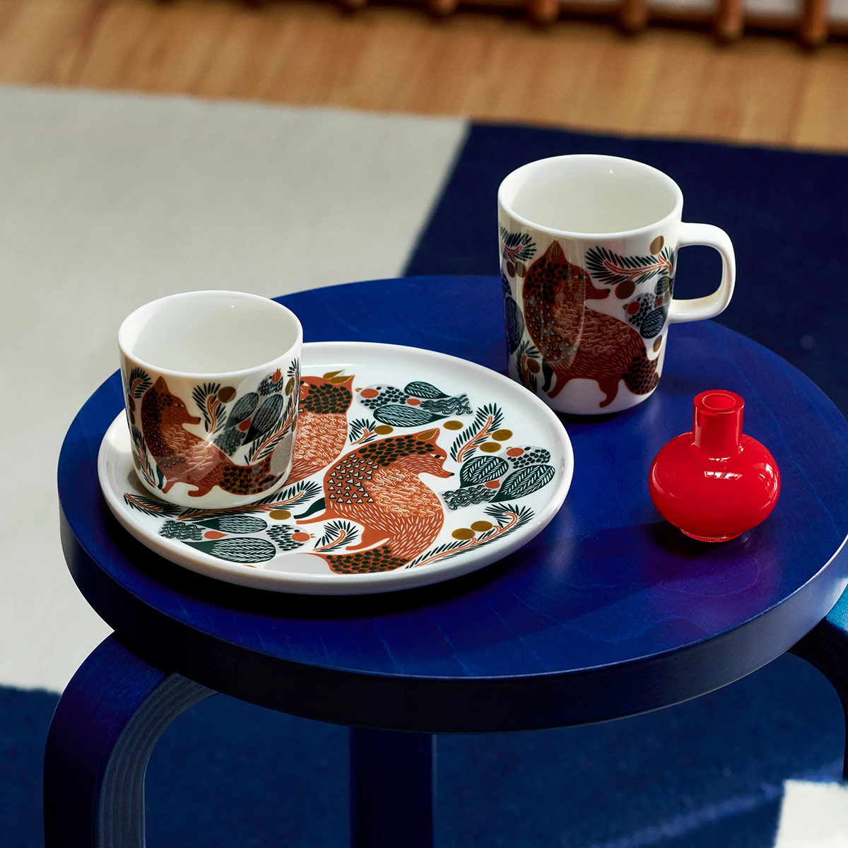 This festive and folkloric print by Aino-Maija Metsola is called Ketunmarja, or “Fox Berry.” As the name suggests, it depicts a whimsical woodland scene of foxes and birds among juicy berries. Here, Marimekko Ketunmarja is featured on a set of coffee cups perfect for all the warm, tasty beverages this season brings. The white stoneware is microwave, oven-freezer, and dishwasher-safe so it can be used for coffee, tea, hot chocolate and more with everyday convenience.