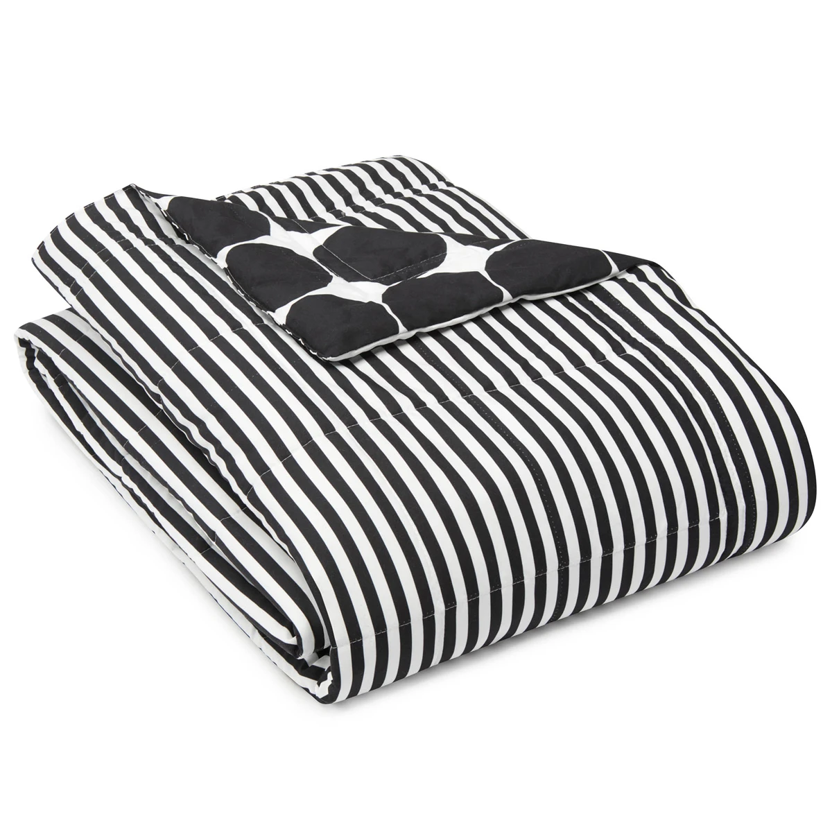 This Marimekko blanket is reversible, featuring Maija Isola’s Kivet print on one side, and the Ajo stripes on the other – both in a classic black and white colorway. Feature whichever one fits your mood for the day, and fold it back to let the other complementing pattern peek out. The blanket is made from a soft brushed microfiber and filled with a down alternative to be hypoallergenic and vegan. Additionally, it is standard 100 by Oeko-Tex certification-tested against a list of 350 harmful substances to be free from chemicals. It has the cozy look and feel of a modern quilted comforter, but is much more lightweight to make it great for layering as part of your bedding or rolling up to bring along on a camping trip or just a trip to the couch; hello, blanket fort! Machine washable, it’s also easy to care for.
