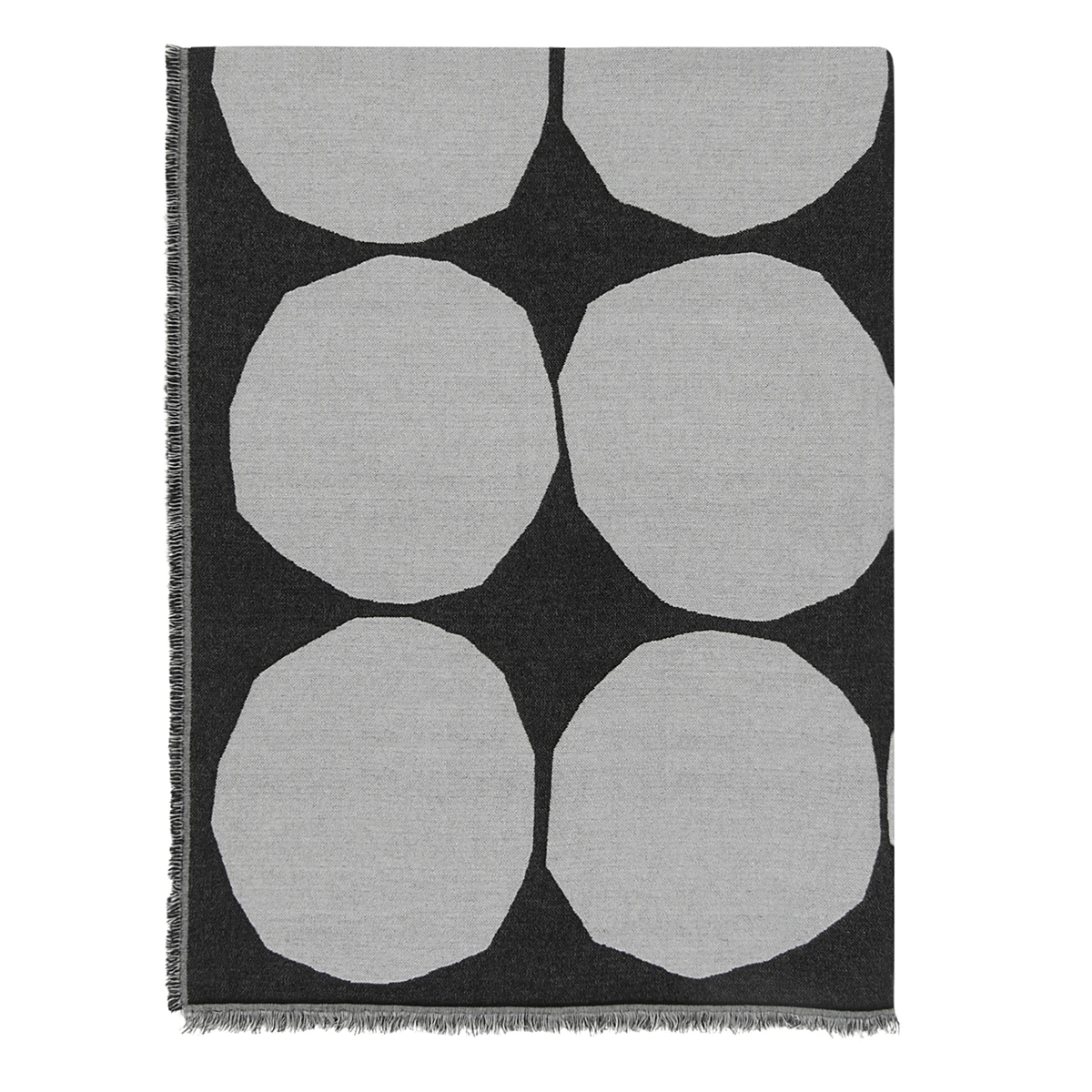 Simple and striking, Kivet (Stones) has been a Marimekko fan-favorite for more than half a decade. Many suspect it was inspired by the rocks that surrounded Maija Isola’s studio home, and was originally created by by cutting out rounds of paper with scissors to achieve imperfect edges. The pattern is featured here on a wool blend blanket that’s warm yet breathable. The stones are actually composed of ivory and black threads, though the jacquard weave creates the look of grey. The blanket is reversible, with the design’s colorway reversed on the other side so it looks great however it’s folded, tossed, or draped. Fringed edges ensure the blanket looks as cozy as it feels for nights in on the couch.