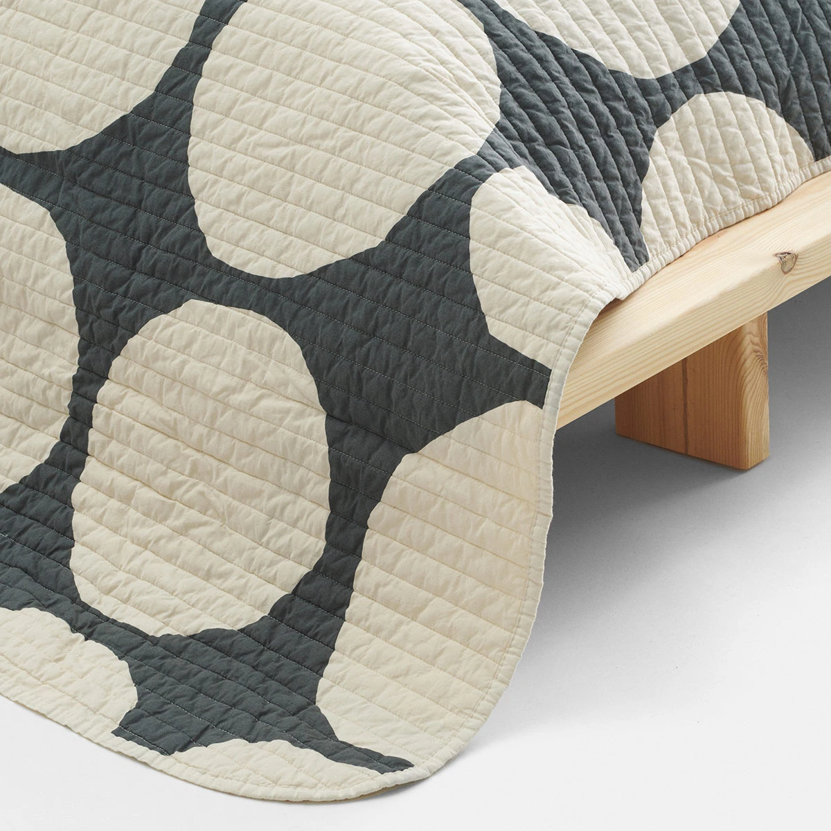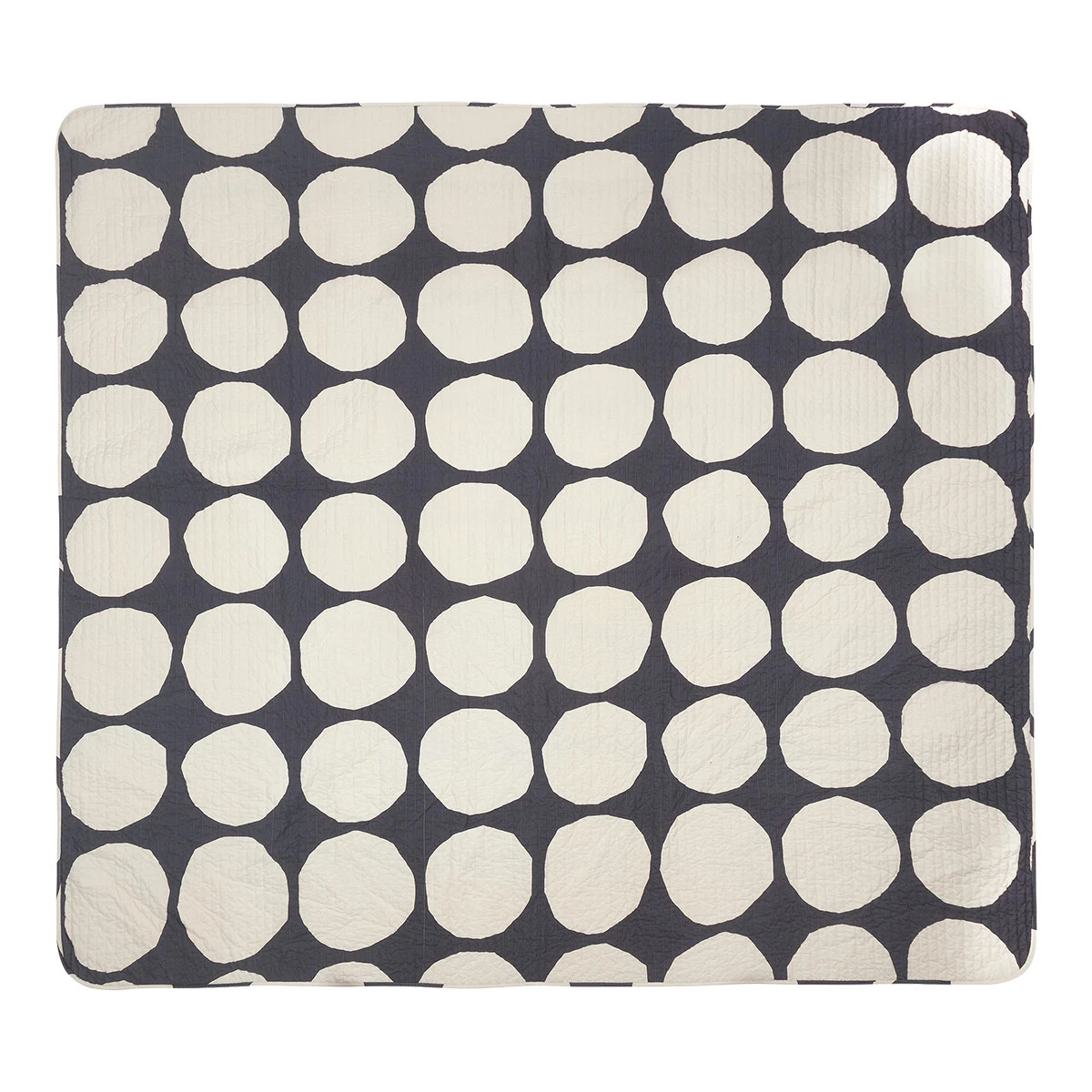 This large, quilted Marimekko blanket features the simple yet striking Kivet (Stones) pattern, a Marimakko fan-favorite for years. Many suspect it was inspired by the rocks that surrounded Maija Isola’s studio home, and it was originally created by cutting out rounds of paper with scissors to achieve imperfect edges. In this neutral charcoal and off white colorway, it will seamlessly fit anywhere in the home, whether that be draped across a couch, decorated atop a futon, or used as a bedspread. The high-quality, 100% cotton blanket is padded for extra warmth and machine washable when needed.