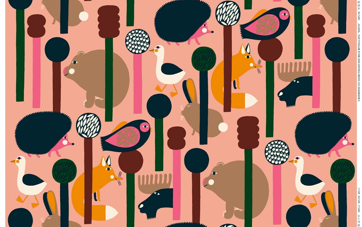 The bright and cheerful Marimekko Kontio fabric features playful animals peeking out from behind the trees. This 100% heavyweight cotton fabric, designed by Aino-Maija Metsola, will brighten any room when crafted into a wall hanging, table linens or anything your heart desires!
