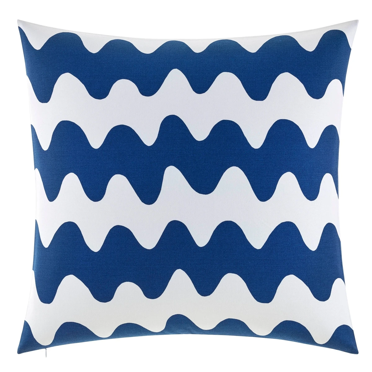 At over 2 feet in width and length, this large square pillow is the perfect pop of plush, print, and color for various area of your home. Use it as a “Euro” style pillow to accent your made bed, or use it as a floor pillow for a soft spot to sit. The 100% cotton canvas exterior has a discreet size zipper to be removed from the included insert. The exterior is printed with bold wavy lines of Maija Isola’s Lokki (Seagull) pattern in refreshing shades of blue and white.
