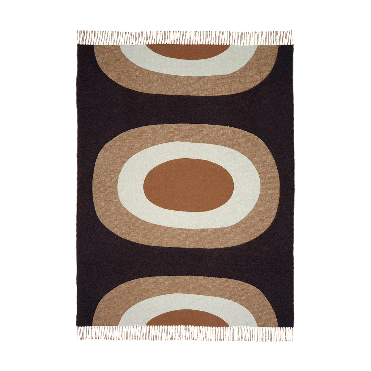 The Marimekko Melooni (Melon) pattern blanket, designed by Maija Isola, is made of a cotton and wool blend. The blanket has a soft, combed surface and fringes at the ends. The combination of browns create a warm and happy feel that you want to wrap yourself in. This throw blanket is sustainable and made from 30% recycled cotton and 25% recycled wool. The Marimekko Melooni print is a beautiful example of the brilliance and timelessness of Maija Isola designs.