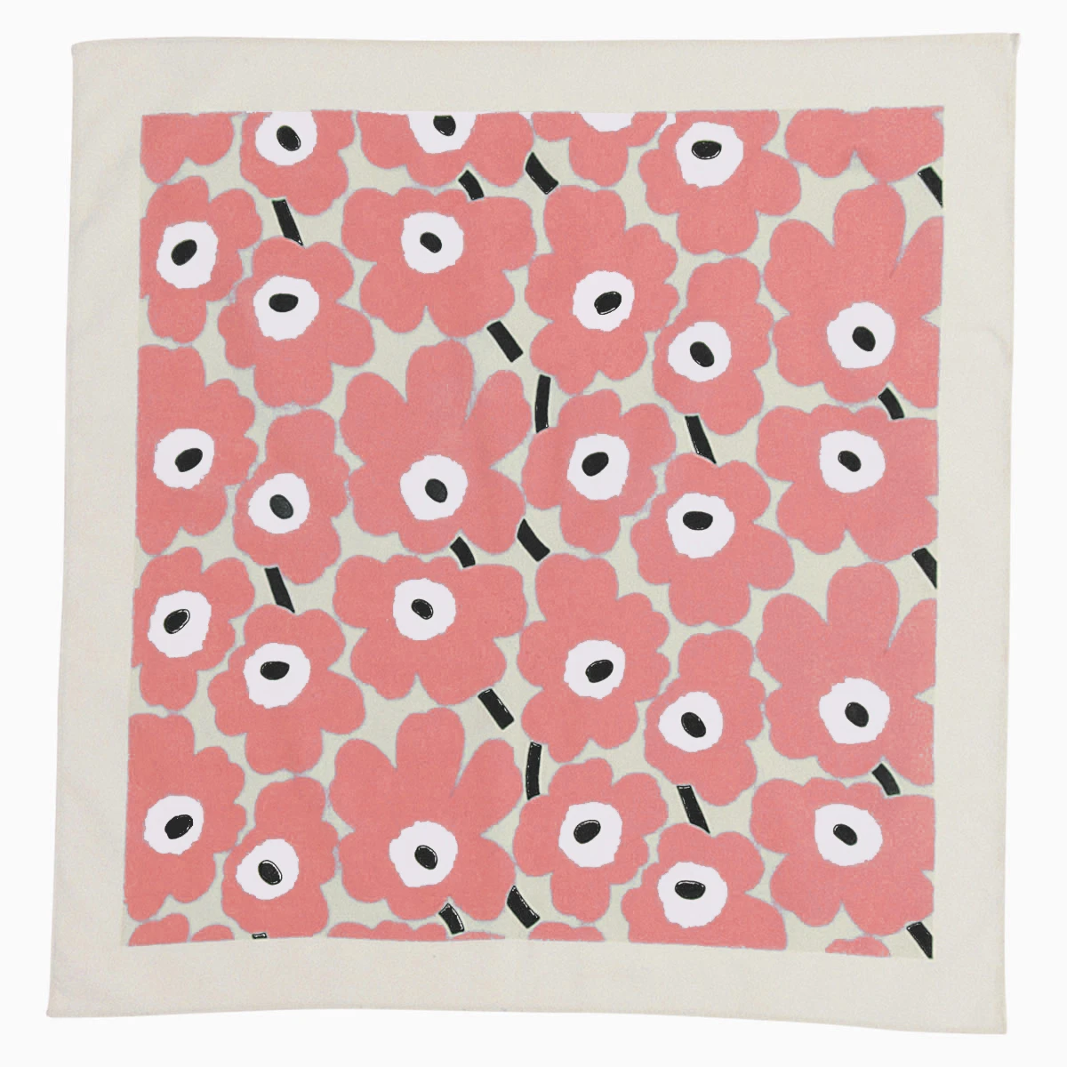 Made from 100% cotton, this stylish square features Maija Isola’s Unikko poppies in a pretty shade of pink with black and ivory accents on a beige background. Wear it as a scarf, wrap it around your hair, or tie it on a purse handle for a soft pop of print.