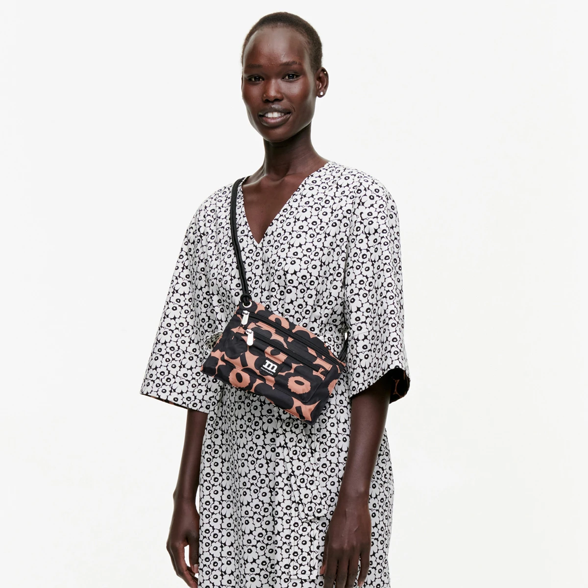Made from 100% recycled polyester, this bag has a durable yet lightweight and sustainable construction. The shoulder strap is adjustable to be worn as a crossbody however feels most comfortable for you. A zipper closure and front zipper pocket keeps essentials secure yet accessible for travel or everyday errands. Maija Isola’s poppy print in brown and black puts the fun in function with this smart bag.