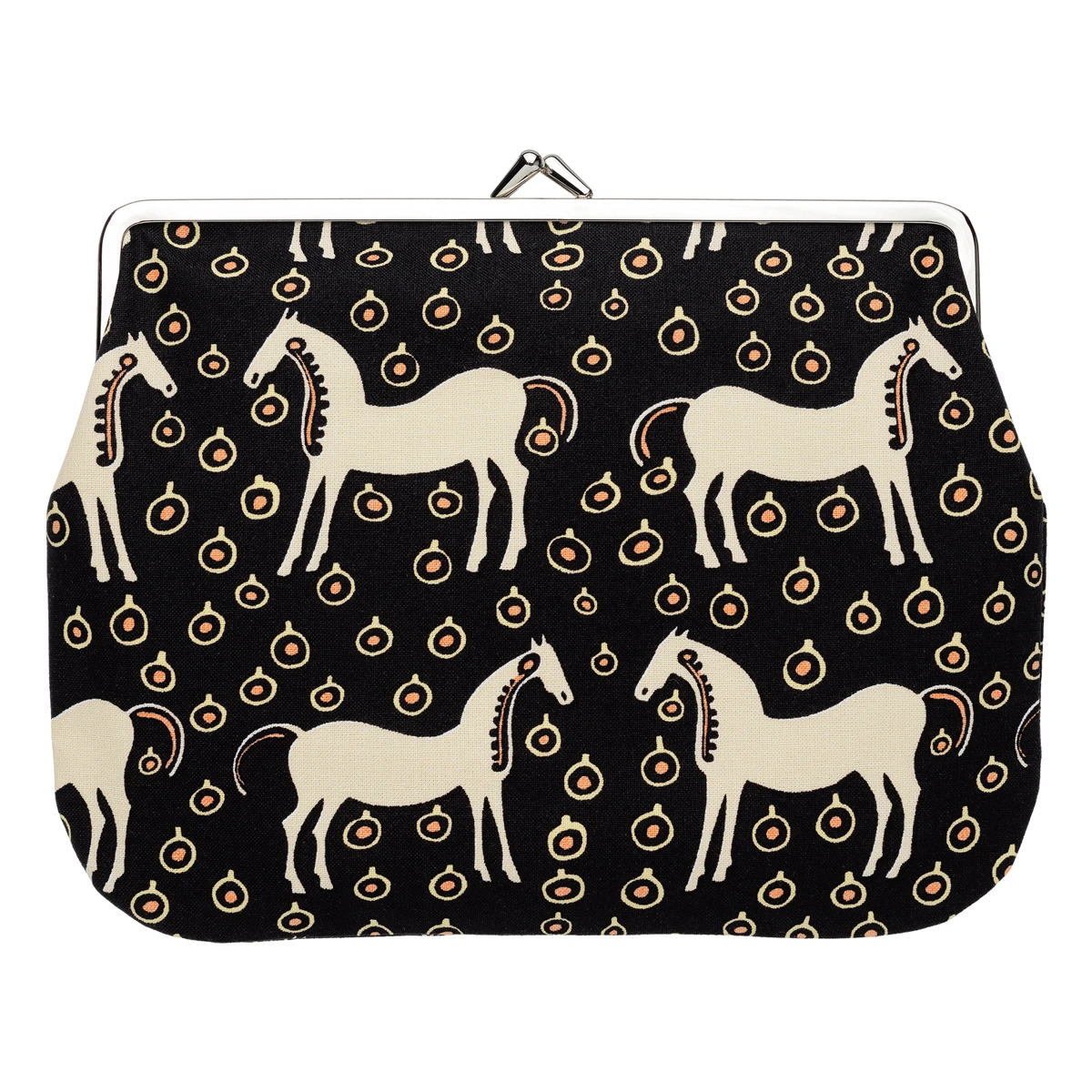 Designer Maija Isola had a dream about running with wild horses in the forest, and was inspired to create this folkloric print. Fittingly named Musta Tamma (Black Mare), it depicts beautiful beige horses and peach apples on a black backdrop. Here, it’s printed on the 100% cotton exterior of a Marimekko coin purse. The large size is perfect for keeping bigger items you don’t want to dig for in a larger bag; cell phones, tissues, toiletries and more can fit within the metal clasp.