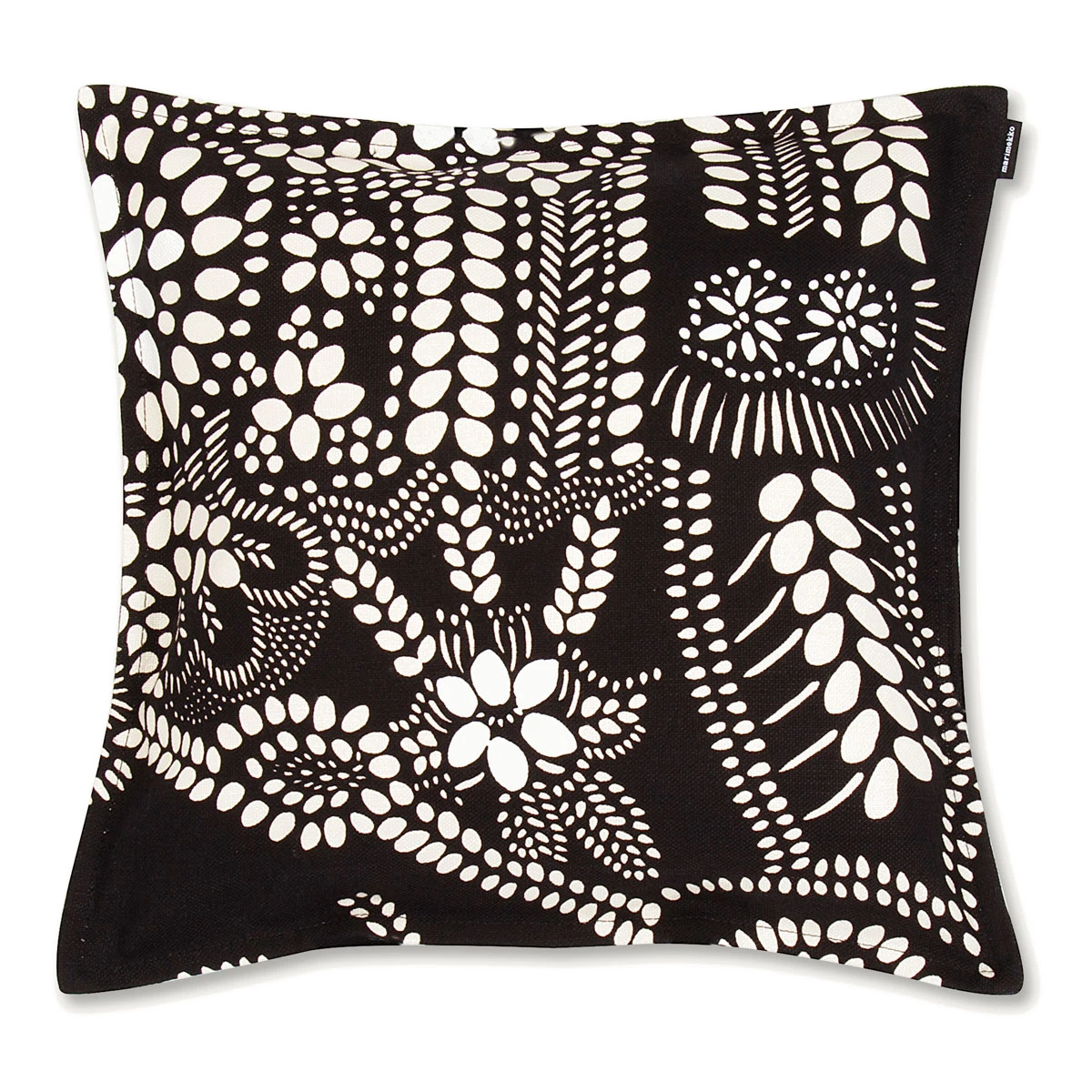 Nature was a source of inspiration for Maija Isola, and the Näsiä print was inspired by the shrub that rises early spring in Scandinavian countryside. Though normally lilac in color, it is modern here in white and cream atop a black backdrop. Made from a heavyweight cotton and linen blend, this cushion cover can be removed from the included insert by means of a side zipper.