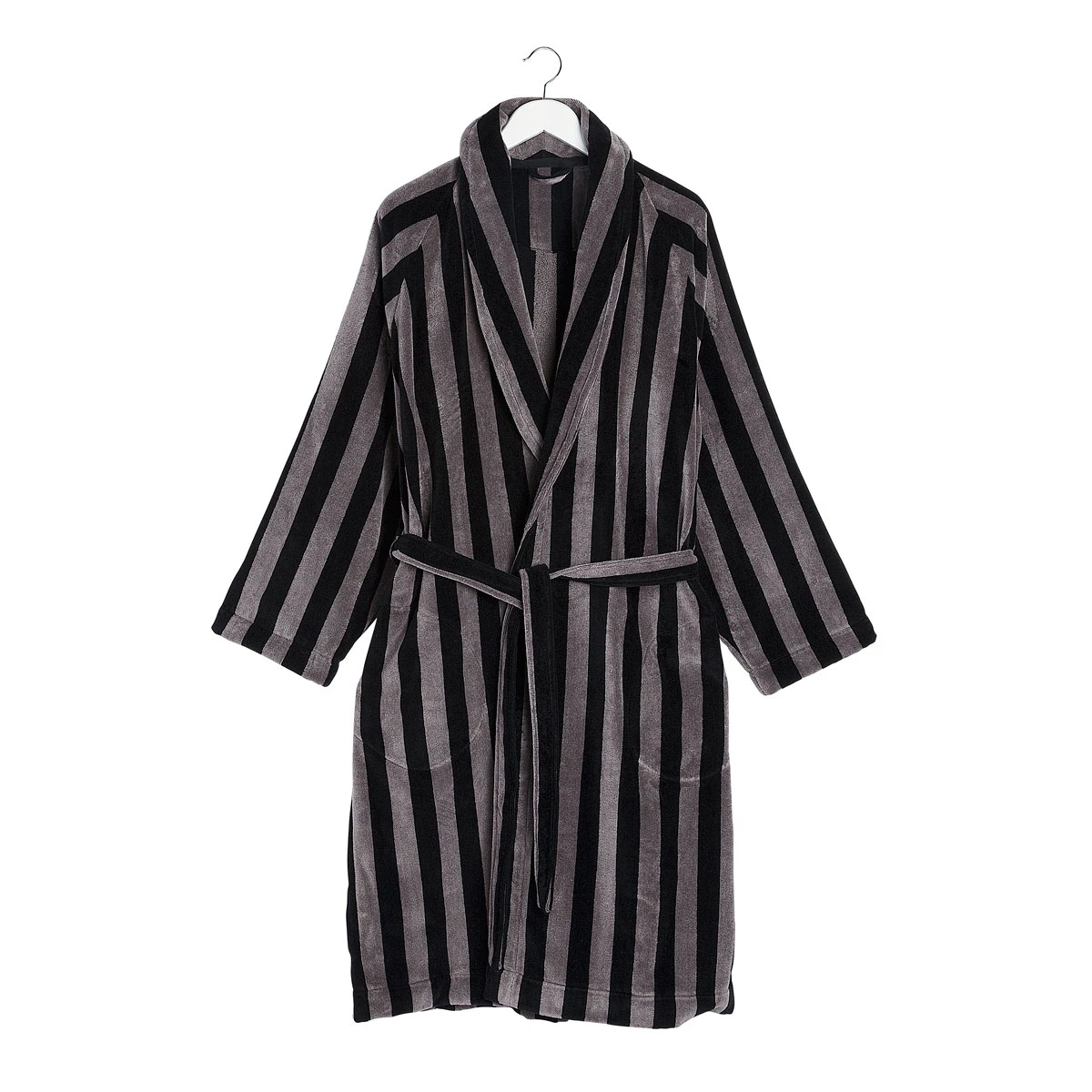 Rest easy in the plush Marimekko Nimikko Black/Grey Bath Robe. The absorbent, soft cotton terry inside keeps you dry and the velvety smooth outside offers maximum comfort. Two roomy side pockets allow you to keep grooming or relaxation essentials handy, while the belt through two loops keeps the robe tucked. A deep shawl collar and long raglan sleeves add to the coziness. Hang the robe by a convenient attached fabric loop. Whether you’re indulging in a long soak, lounging with a weekend coffee, or transitioning into a busy day, this robe will wrap you in the comfort you crave.Small/Medium Measurements: