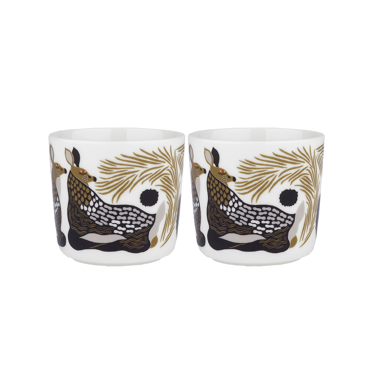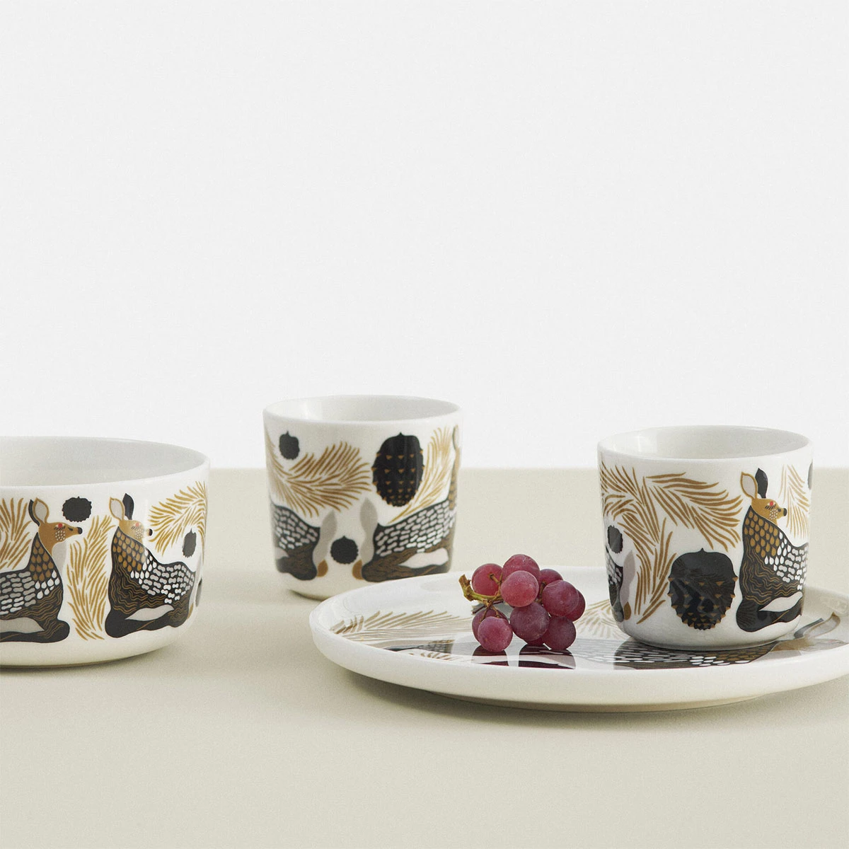This folkloric Marimekko coffee cup set features enchanting white-tailed deer prancing among the pine trees. The Peura (Deer) pattern continues designer Aino-Maija Metsola’s tales from the Nordic forests and beyond, and these handle less cups for two will be perfect for sipping your morning espresso around the fireplace. The Marimekko Peura Coffee Cups have earthy shades of brown, beige and black, while the eyes of the deer pop with a bright red to show their alertness. The white stoneware is conveniently microwave, oven, freezer, and dishwasher safe, ideal for everyday dining.