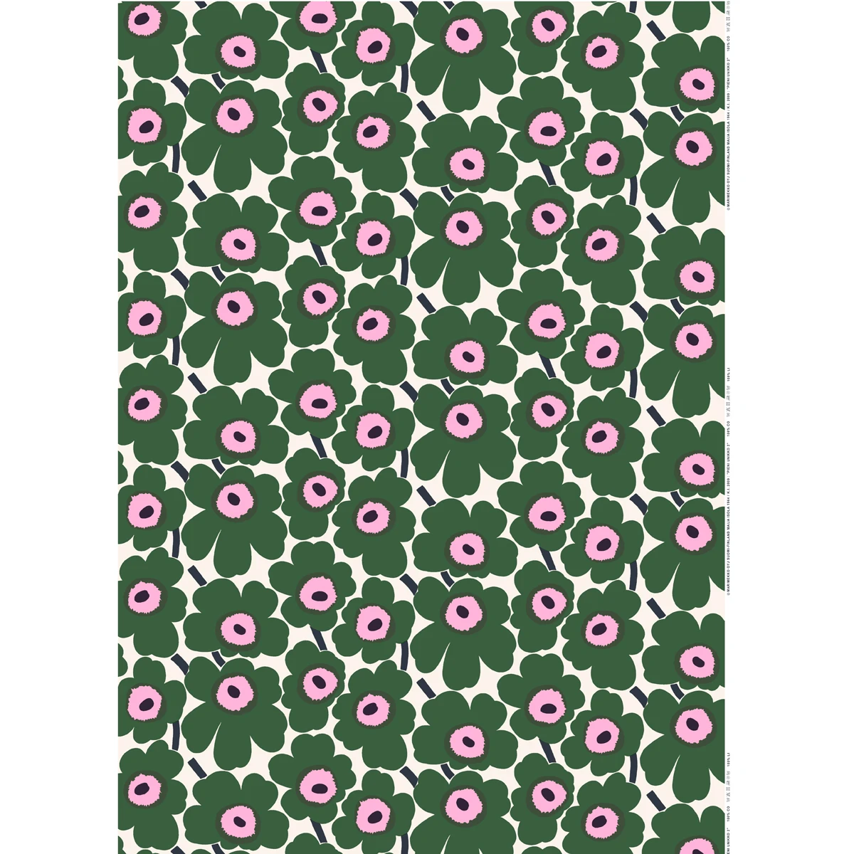 Many design fans around the world revere Unikko as exemplary Marimekko. Dating to 1964, the poppies are now available in green with pink and black accents on a cream backdrop in a Pieni (smaller) scale. The 100% cotton fabric is machine washable, so it is as easy to work with and care for as it is versatile. Make statement drapes, a custom tablecloth, or a one-of-a-kind wall hanging.
