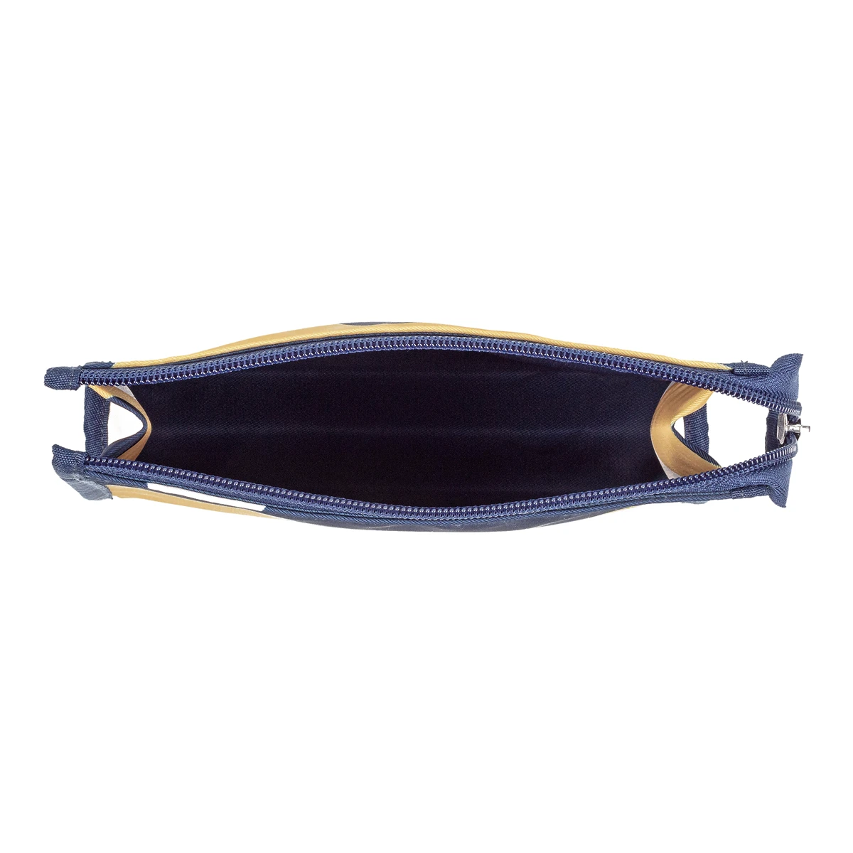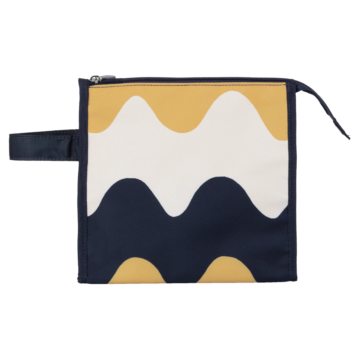 Recycled polyester is a genius material for Marimekko makeup bags; it’s environmentally friendly, sturdy, and easily cleaned. Spills are easily wiped up and for bigger messes, this cosmetic pouch can be tossed in the wash. The roomy interior of this zipped bag is also lined with the same smart material, and the flat bottom and wide depth allows it to stand up on its own. Plus, it has four interior side pockets to hold brushes and other tools upright. The Marimekko Nuuka bag is just as beautiful as it is functional with Maija Isola’s Pikku Lokki (Little Seagull) pattern on the exterior in shades of navy blue, cream, and a mustardy beige. She was inspired by the waves forming on her curtains in the sunlight to create this groovy print. The finishing touch is an embroidered Marimekko logo on the front, as well a loop handle for easy storing and carrying.