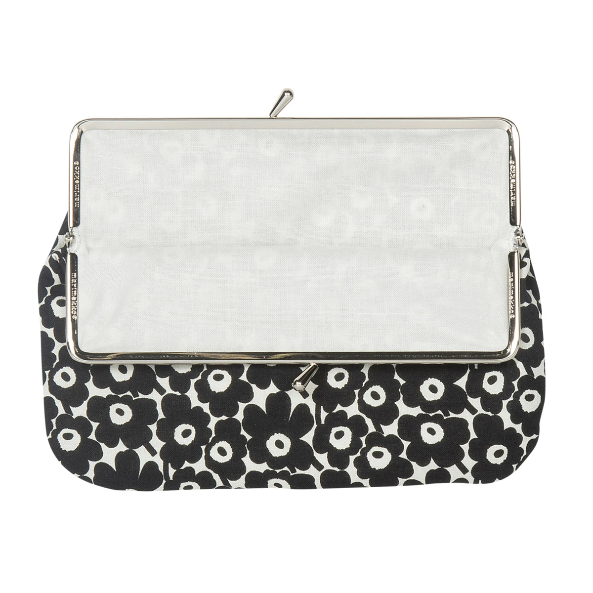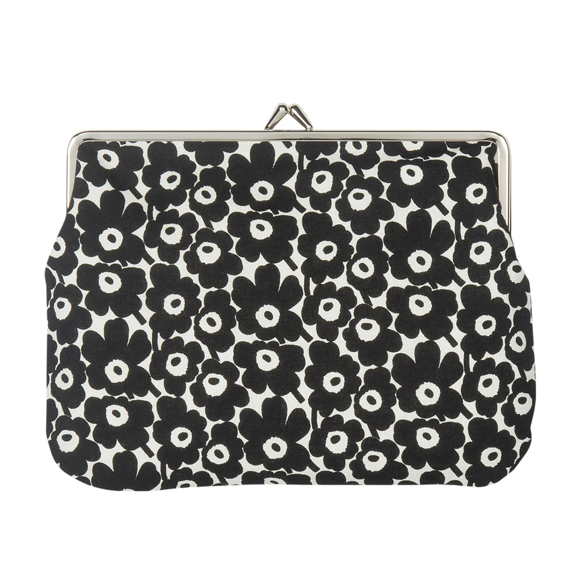This Marimekko coin purse is a place for the larger things in your life that you don’t want look in a big bag. Cell phones, tissues, toiletries and more can fit within the metal clasp. Made from 100% cotton, the exterior is printed with the pretty poppies of Maija Isola’s Unikko pattern in a scaled down size in shades of ivory and black.
