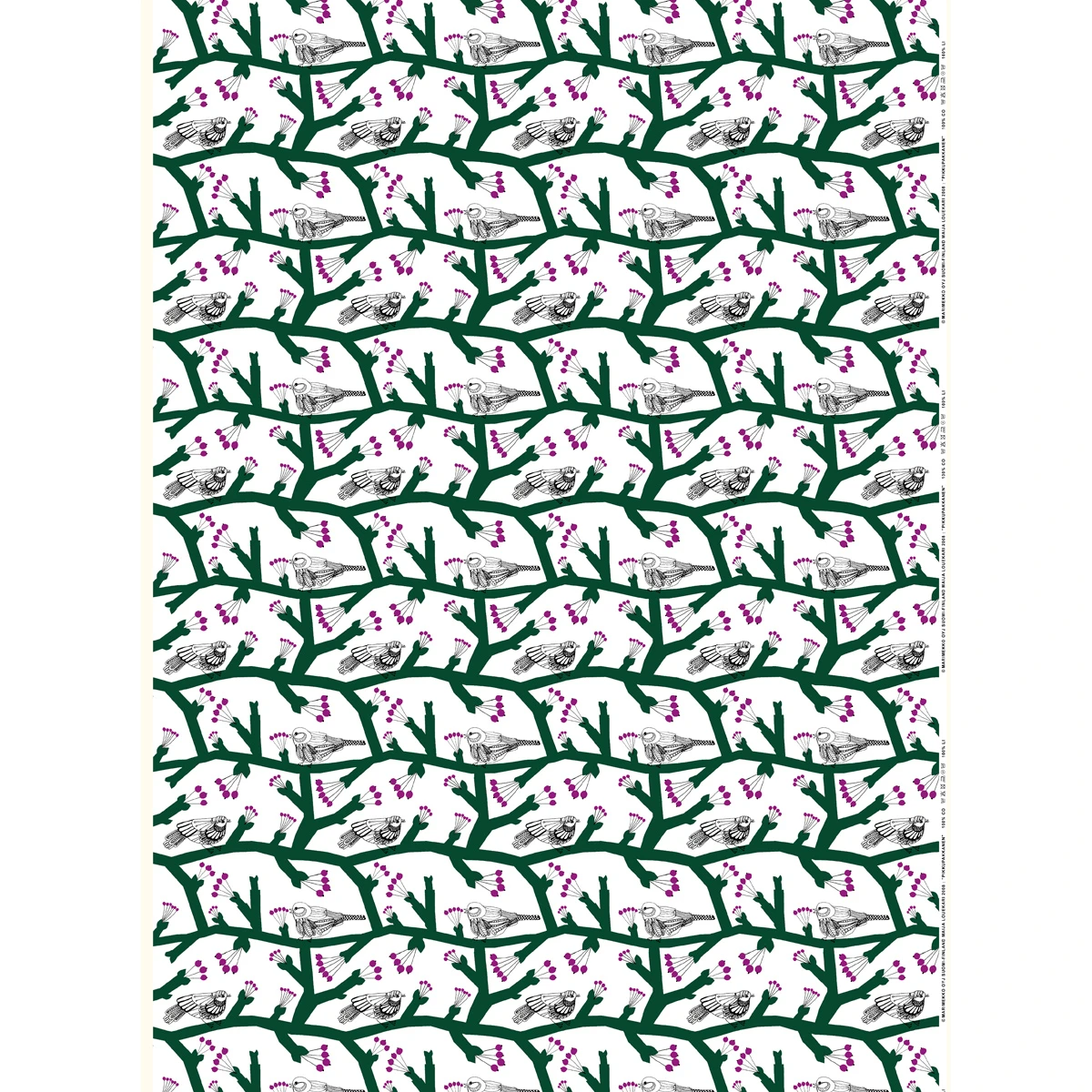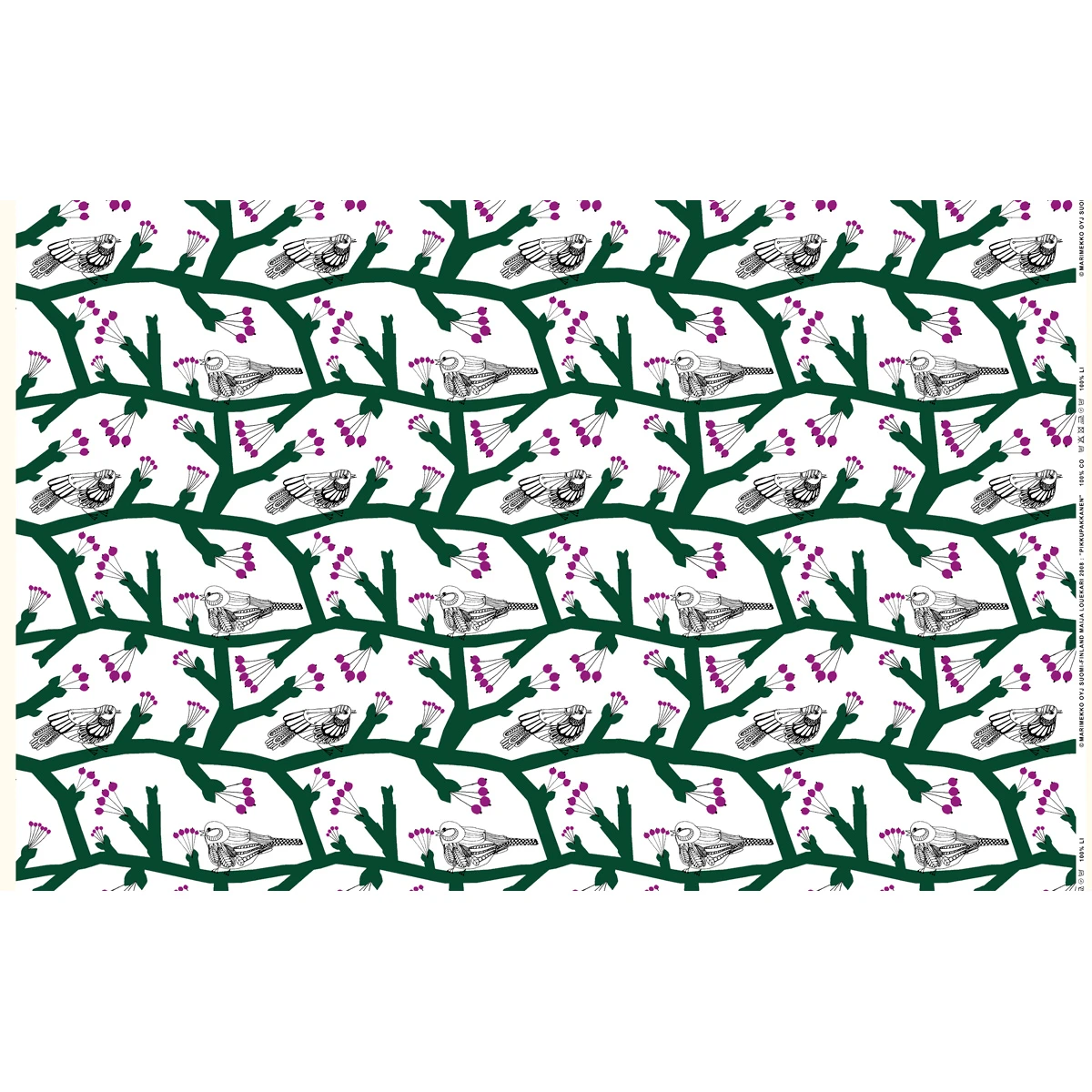 Maija Louekari’s Pikkupakkanen pattern features folkloric birds, each striking in contrast and detail among simple berry branches on a crisp snowy backdrop. Printed in Finland on 100% heavyweight cotton fabric in a fine panama weave, this pattern would make a stunning wall hanging, tablecloth, or pair of curtains. The fabric feels slightly thicker than standard Marimekko cotton fabrics with a more canvas-like feel that that mimics the construction and durable texture of the Panama hat.