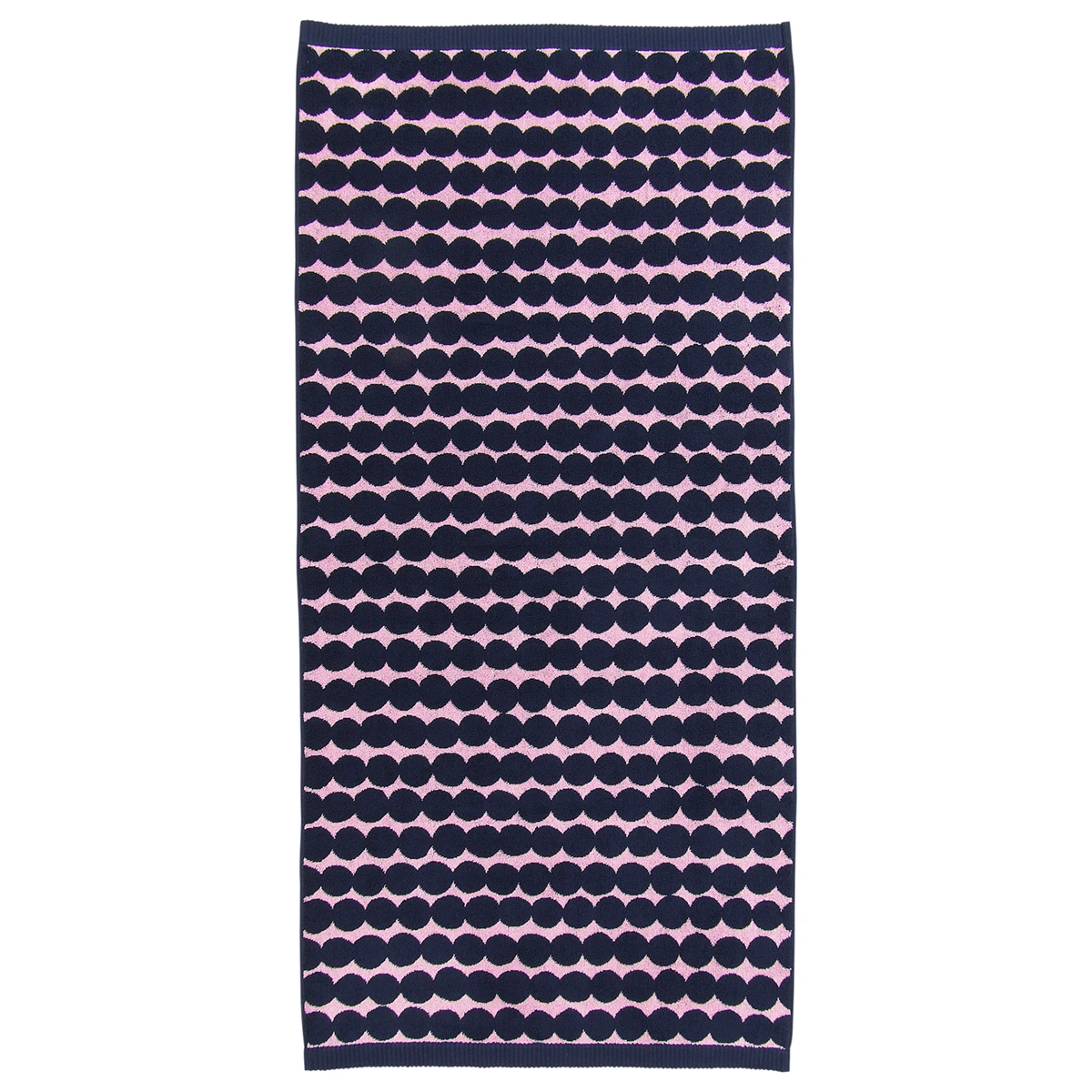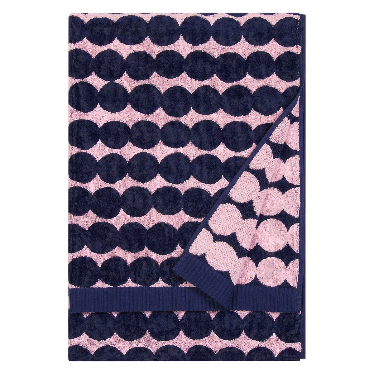 This Marimekko bath towel is as lovely to look at as it is to wash up and dry off with. Maija Louekari’s bold Räsymatto (Rag Rug) pattern adorns the highly absorbent and fast drying 100% cotton. The pattern was inspired by the rag rugs Finnish cabins often have, a wonderful tradition and story to bring to your bath textile collection. The colorway is reversed on the back side, so that the dots are pink and the background is navy blue.