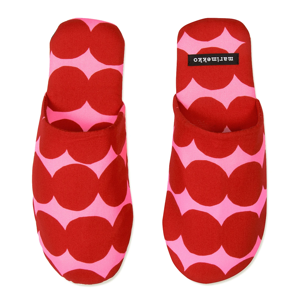 Kick back in timeless style with the Marimekko Rasymatto Pink / Red Slippers. They feature Maija Louekari’s popular Räsymatto (Rag Rug) pattern in a fearless and fun new colorway. Made from 100% cotton and equipped with rubber soles, the slippers will feel as wonderful as they look while you’re starting or ending a long day.