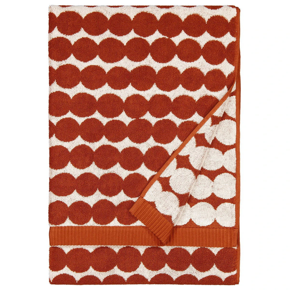 This Marimekko bath towel is as lovely to look at as it is to wash up and dry off with. Maija Louekari’s bold Räsymatto (Rag Rug) pattern adorns the highly absorbent and fast drying 100% cotton, and the white and chestnut brown colorway is reversed on the other side. The pattern was inspired by the rag rugs Finnish cabins often have – a wonderful tradition and story to bring to your bath textile collection.