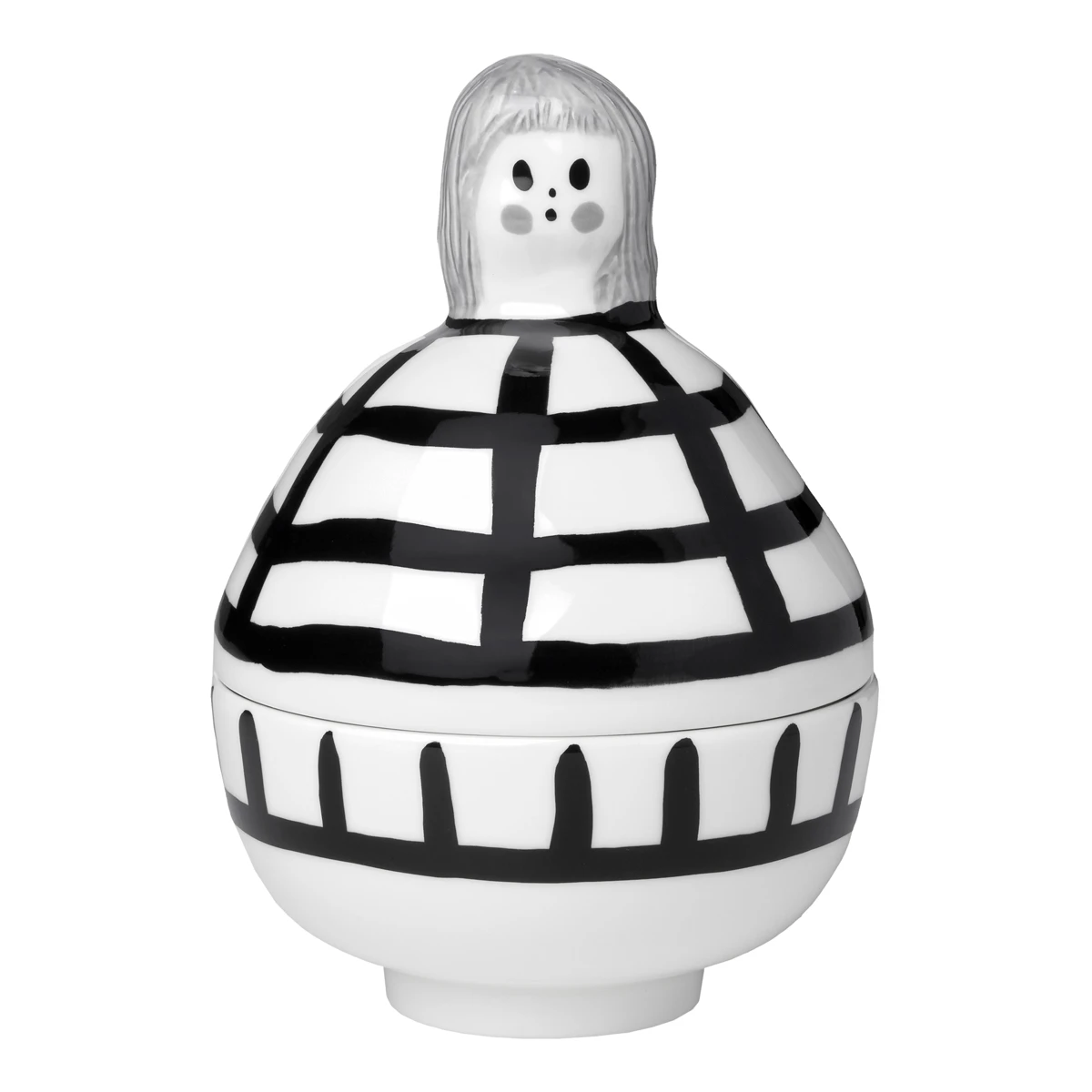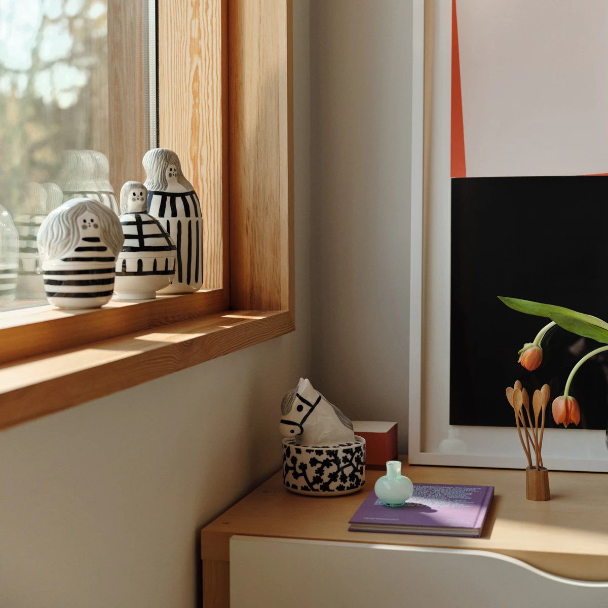 Called Rauha (Peace), this piece is part of the Marikyläläiset collection by Jenni Tuominen. The bottom portion is a familiar shape from the Marimekko Oiva dinnerware line, while the top features the playful face of a person. The two parts separate and rejoin to act as storage for supplies or trinkets while the bottom part can be used as a small bowl on its own when needed. Though Rauha can serve many functions, it’s truly a piece of collectible art at heart. Each one is hand-painted to have its own unique personality, much like the individual it depicts. It will add a bit of whimsy and wonder to bookshelves, mantles, countertops and more. Boxed in the Marimekko 70th anniversary packaging, it also makes for a fantastic gift.