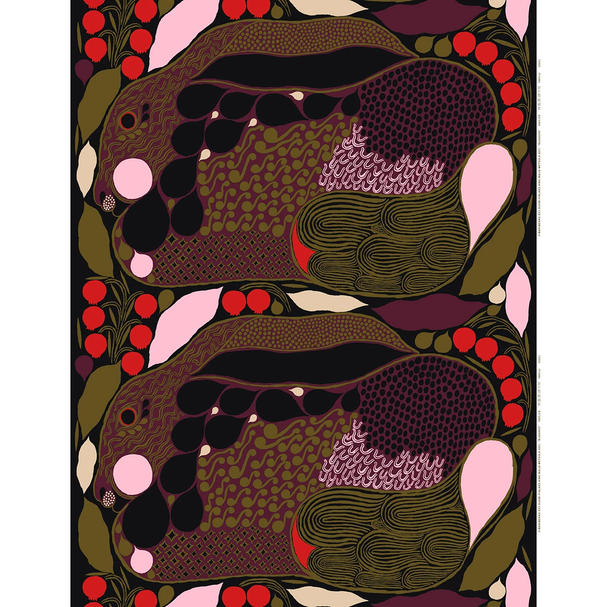 Rusakko, the hare, crouches amidst dark vegetation and bright pomegranates. Inspired by folklore, artist Aino-Maija Metsola has developed a series of ornamental animal motifs in her signature style. Rusakko makes an interesting fabric in 100% cotton. Depending on how you choose to cut this large print, you can achieve a wide variety of colorways, compositions, and styles.