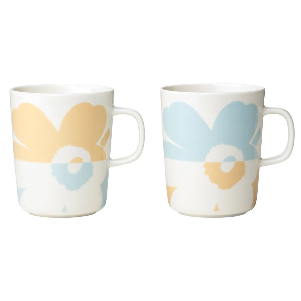 This pair is perfect for coffee or tea for two. In beige and aqua in reverse colorways, they are bright, graphic, and joyful. The Suur Unikko pattern celebrates seventy years of Marimekko’s original prints and colors. Made from white stoneware, the pieces are microwave, oven, freezer, and dishwasher safe. The set of two comes boxed in the special jubilee year packaging, making it a great gift for fans of Marimekko or the iconic Unikko (Poppy) design.