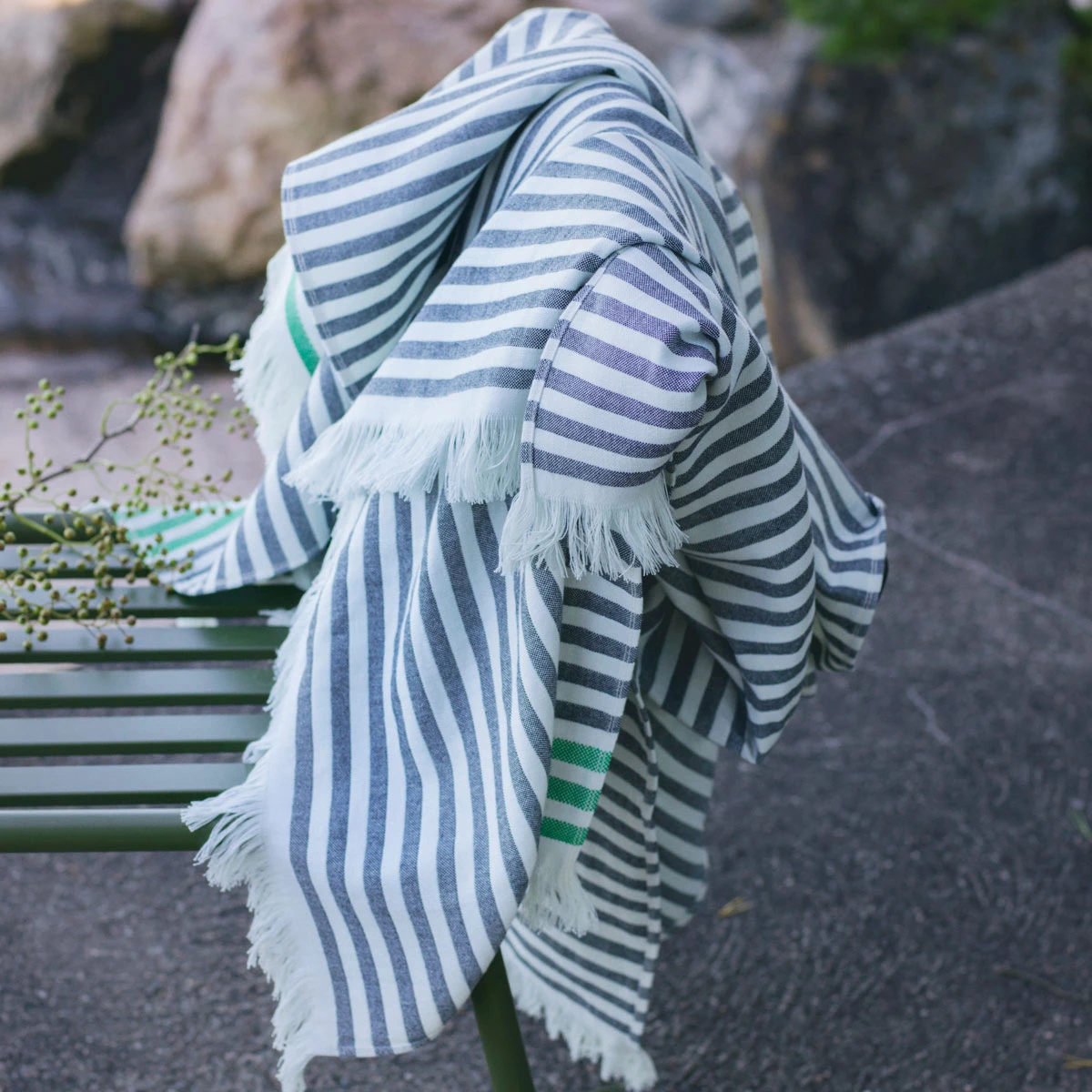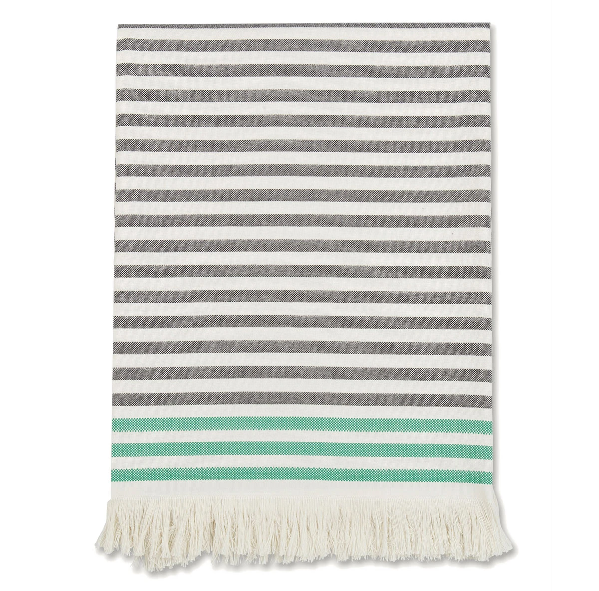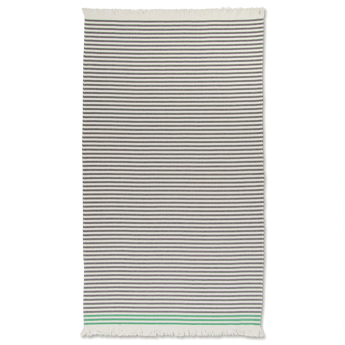 Also called Hammam towels, Turkish towels are much lighter in weight and faster drying than standard bath towels but even more absorbent and durable. Weighing only a third of what typical terry towels would, they are easy to store and transport. This makes this towel great for taking to the pool, beach, or even a picnic. The beautiful, fringed textile art can also be used as a tablecloth, yoga mat cover, or summer blankets. The flat weave, as opposed to the conventional loop/pile construction, also makes them less likely to trap allergens. The 100% cotton is machine washable, and it will only become softer with each wash. These Turkish towels celebrate the 50 year anniversary of Annika Rimala’s Tasaraita (Even Stripe) pattern. The pattern was first featured on unisex shirts, and half a century later, still serves as a symbol of equality for the Finnish brand Marimekko. Their neutral colorway of cream and black is contrasted by a pop of green, perfect for welcoming the lush life that will soon spring up.