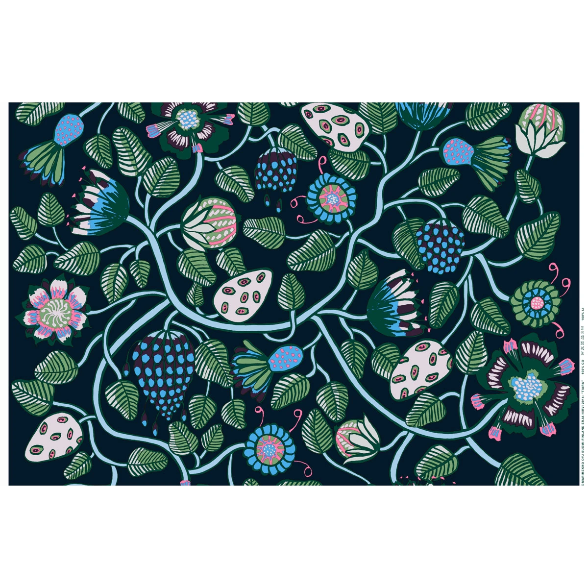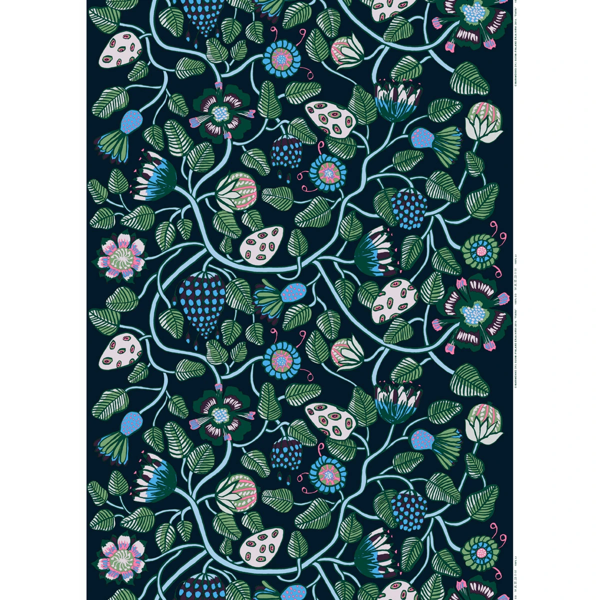 Erja Hirvi’s Tiara pattern winds strawberries and flowers in a colorway of green, pink and grey on a navy blue backdrop on this Marimekko fabric. The cotton is smooth and flowy, but the acrylic coating makes the fabric highly resistent to stains and easy to wipe clean. Ideal for a tablecloth, runner, smock or bib, the durable and vibrant pattern is ready for work and play.