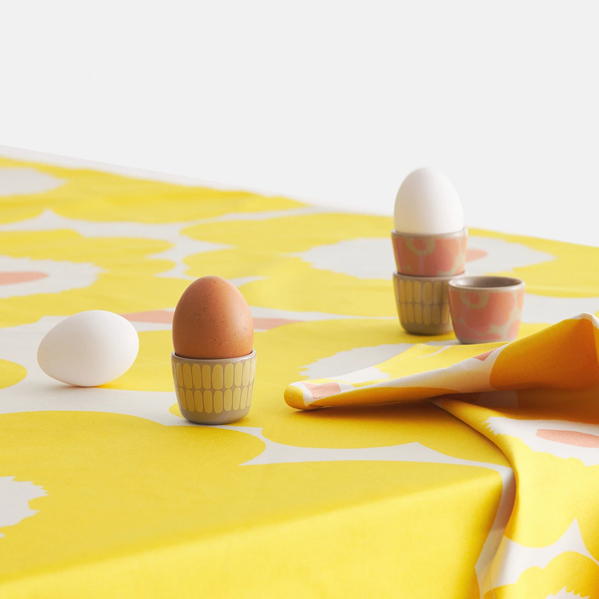 Add some fun to your breakfast with this playful and dynamic egg cup duo. Maija Louekari’s bean-shaped Alku (beginning) pattern, which represents seeds that grow into vast flowers, is featured on one cup in a spring yellow colorway. Meanwhile, Maija Isola’s famous poppies bloom on another cup in a warm pink colorway. Indulging in soft-boiled eggs becomes all the more delightful with this porcelain pair, and the joyful hues bring a warm welcome to the table setting.