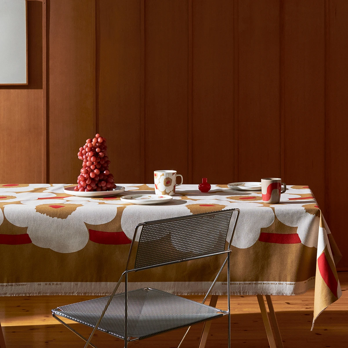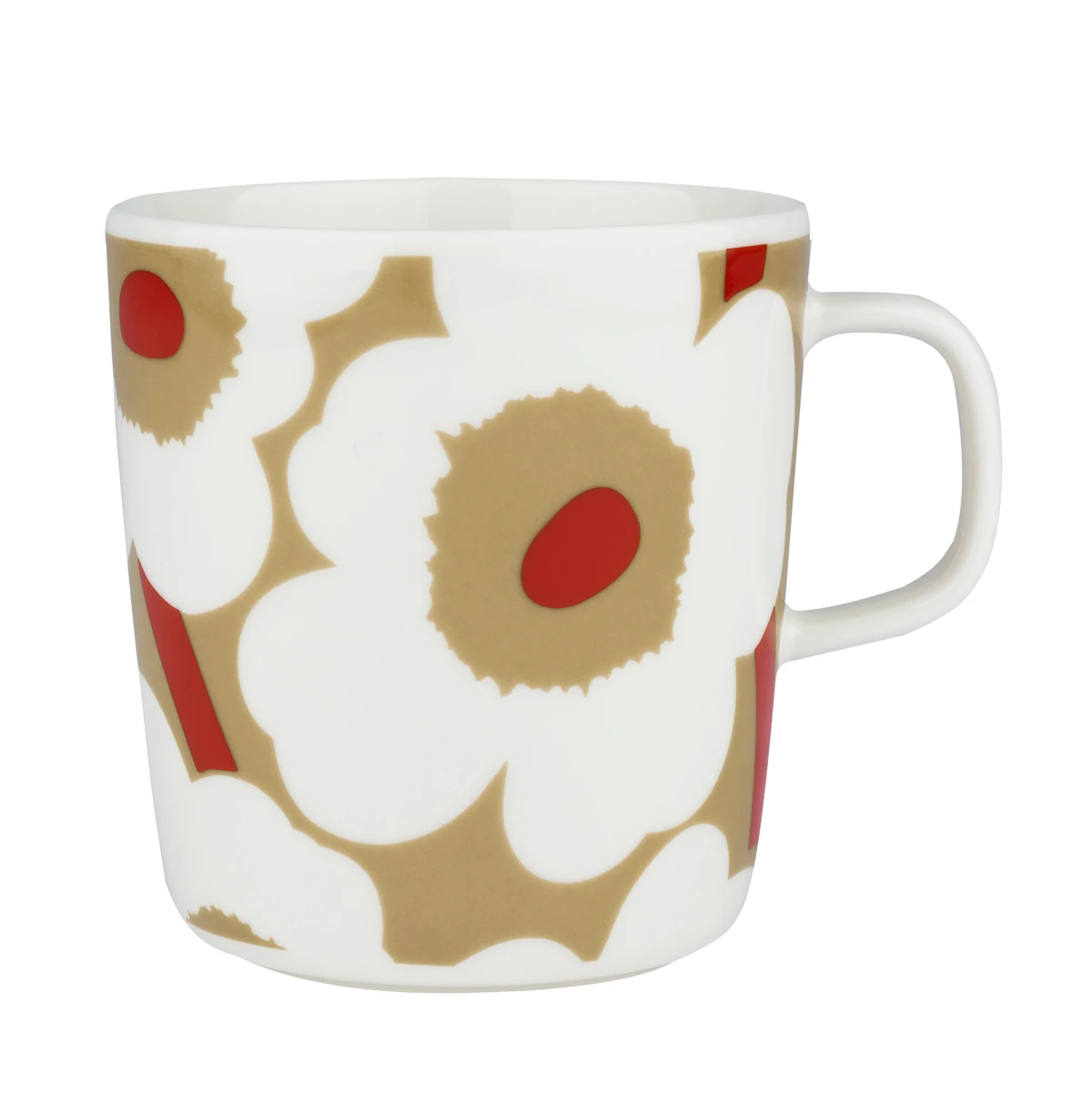 This joyful Marimekko mug is just festive enough for the holidays, but also appropriate for year-round use. Featuring the classic poppies of Maija Isola’s 1964 pattern Unikko, the white flowers pop on a beige backdrop, topped off with bright red centers and stems. Perfect for a cozy cup of coffee or tea around the fireplace, this Marimekko Unikko mug will become your go-to festive drinkware while fitting perfectly in an existing collection of Marimekko dinnerware. The white stoneware is conveniently microwave, oven, freezer, and dishwasher safe, perfect for everyday dining.