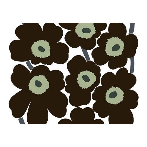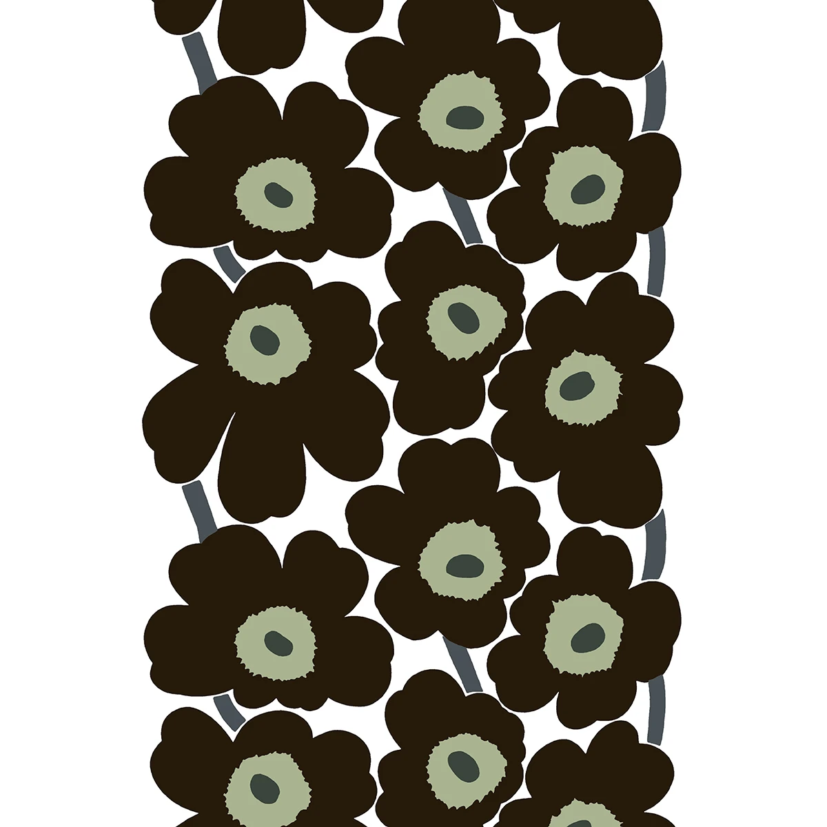 The Unikko Marimekko poppy fabric in black displays black flowers with khaki green centers and dark chocolate stems. This popular poppy flower design was created by Maija Isola in 1964.