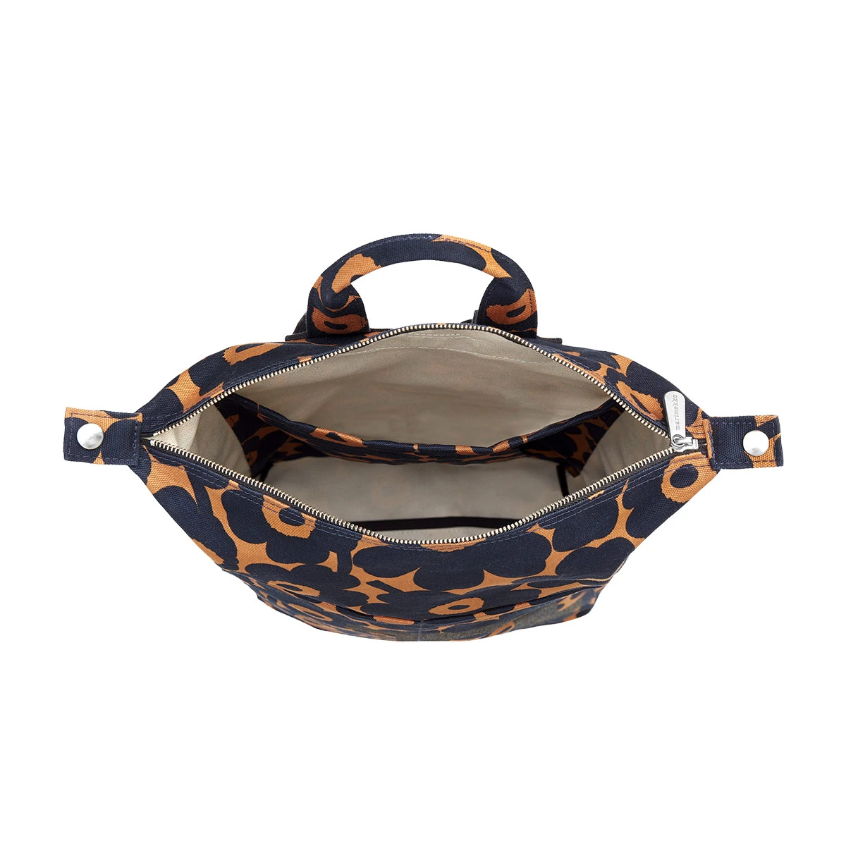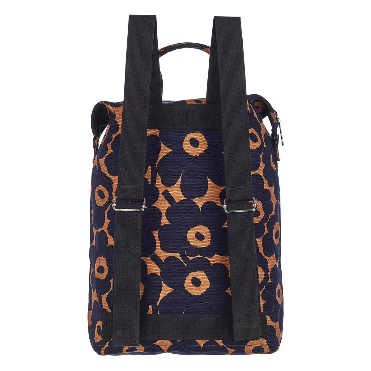 Conveniently carry everything you need for the day in style with this Marimekko backpack. Maija Isola’s poppies from her iconic 1964 Unikko pattern stun in this new brown and navy blue colorway, bringing fashion to the simplicities of carrying around everyday items. It’s sturdy cotton canvas material can hold all of your necessities, even those heavy books and electronics. There is a large open pocket on the inside to fit a laptop, as well as two open pockets on the front for easy access to essentials. The straps are adjustable to your liking, and you may attach the ends of the zip top to the sides of the bag with snap values to change the silhouette. Materials include 100% organic cotton, ensuring long-lasting and sustainable use.