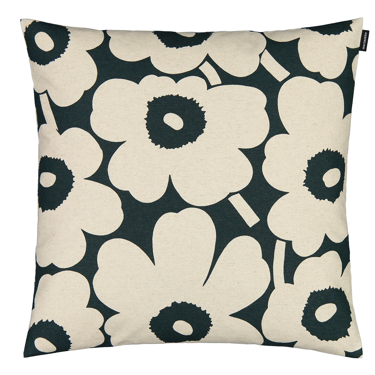 Maija Isola’s Unikko pattern feels organic both in shape and color with a dark green background and the natural raw hue of the cotton-linen material. A side zipper allows the Marimekko cushion cover to be easily removed from an insert for machine washing.