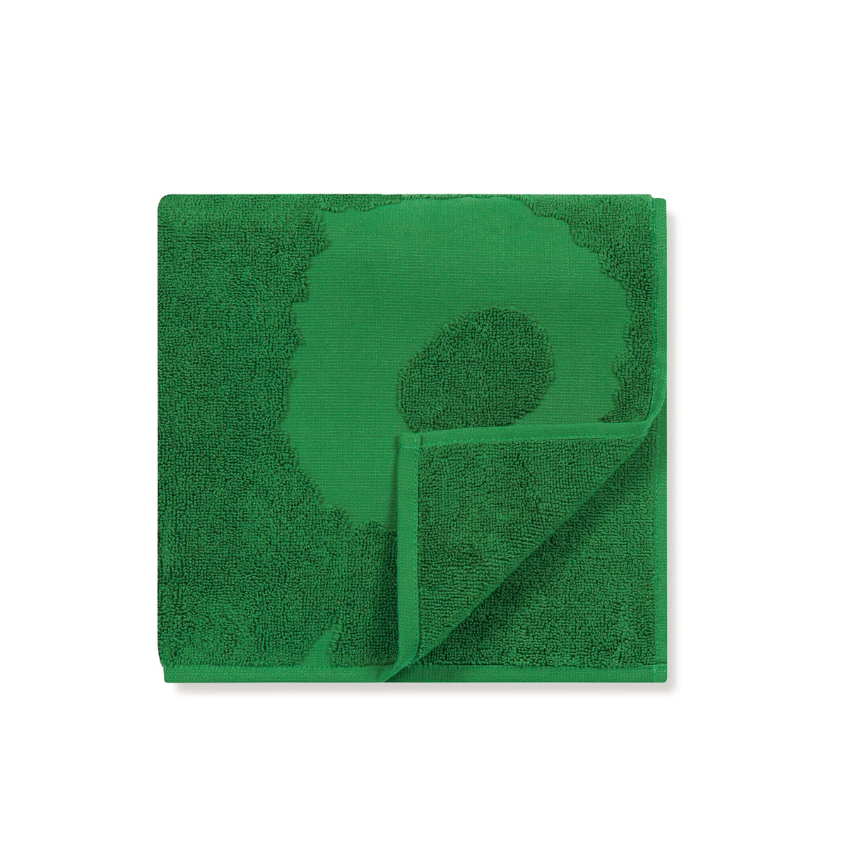 Express your love for Maija Isola’s poppy print in a way that feels soft and subtle. The 1964 Unikko pattern on this generously-sized green guest towel is revealed purely through the embossment of the petals, stems and centers. This variation in texture does not affect the plush, durable and absorbent quality of the 100% cotton terry composition. A nod to prints but a true solid, this hybrid could be beautifully combined with other Marimekko bath towels, such as Marimekko Nimikko and Ujo, for a unique yet cohesive linen closet.