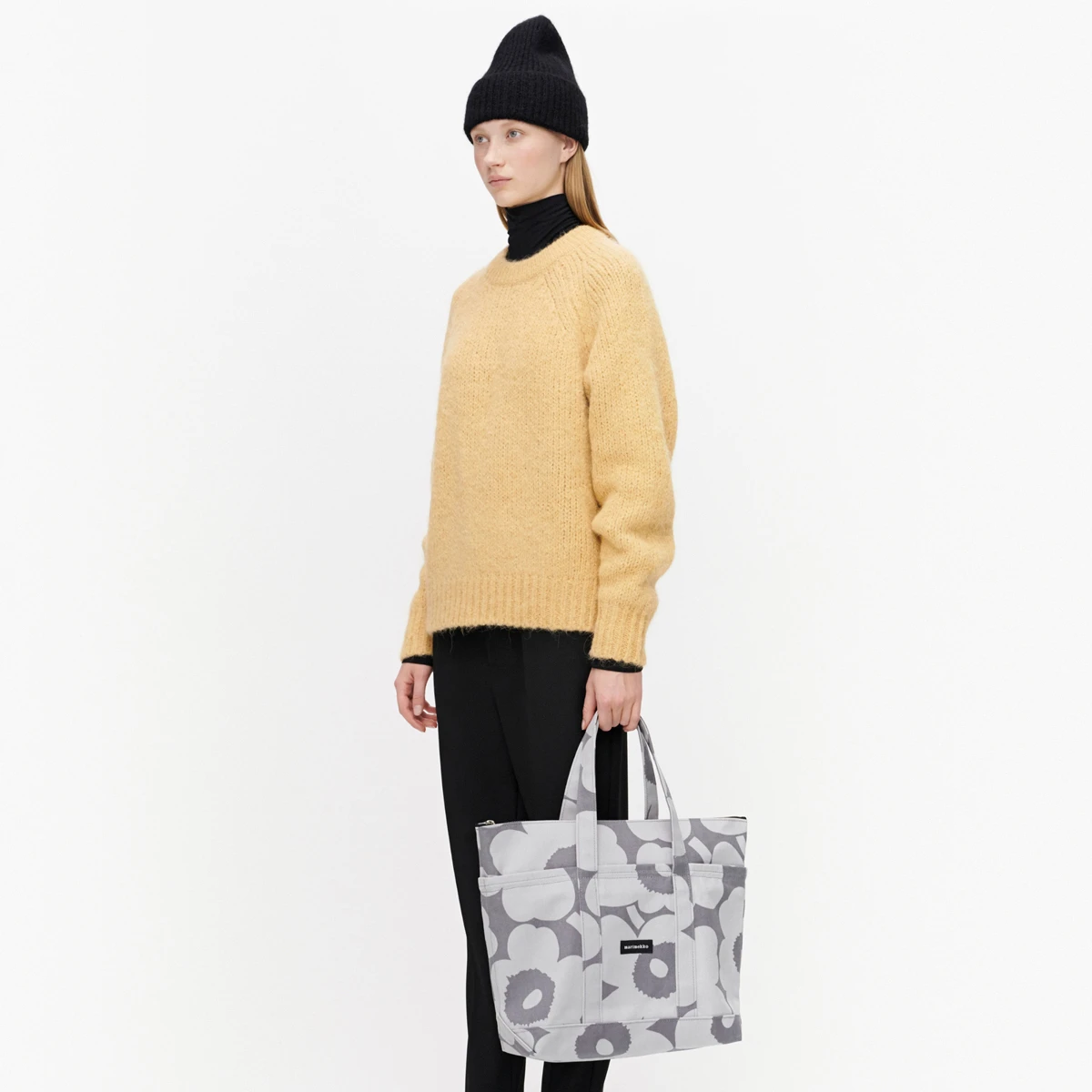 Pack up the Marimekko Uusi Mini Matkuri (New Mini Traveler) Bag with all the essentials for a weekend adventure. Made of sturdy cotton canvas, this heavy-duty bag is both durable and lightweight. Tote it by its two reinforced handles. The roomy interior features a zippered pouch and two pockets, making it easy to stay organized while carrying more than one day’s supplies. It feature’s the famous poppies by Maija Isola in wintry yet neutral shades of grey and silver for a modern, minimal, and monochromatic look.