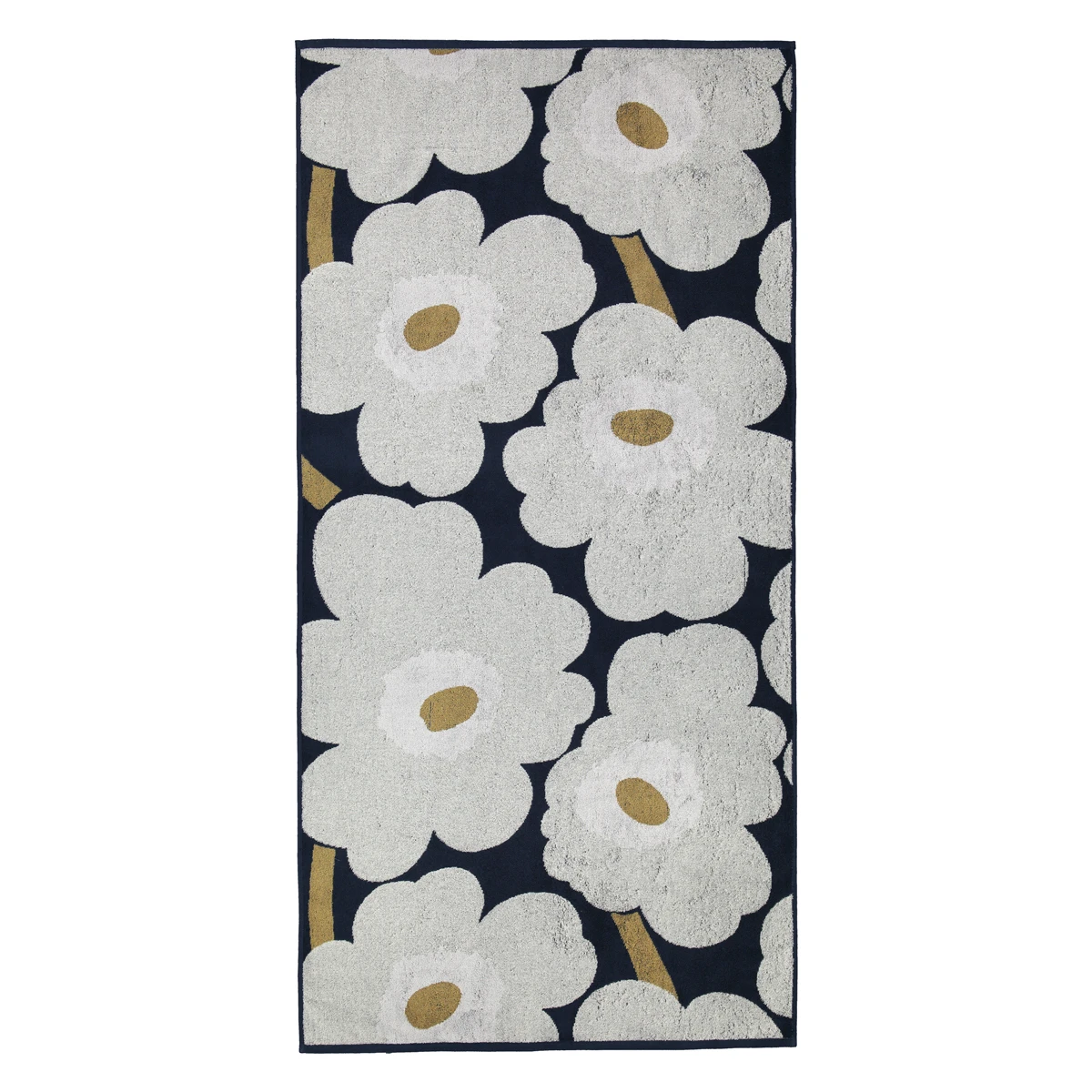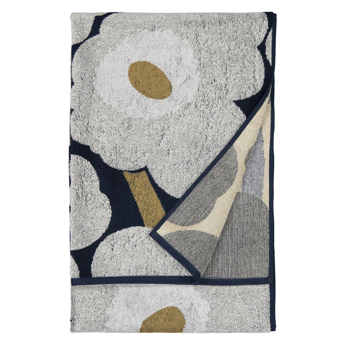 Maija Isola’s often bright pattern Unikko is still as bold in neutral and natural shades of navy, grey, white, and olive, but perfect for setting a serene scene in the bath. The 100% cotton bath towel is lightweight enough to be fast-drying but still fluffy and absorbent. Hang from the attached loop, or fold it over a towel bar for a pop of poppies to brighten your day.