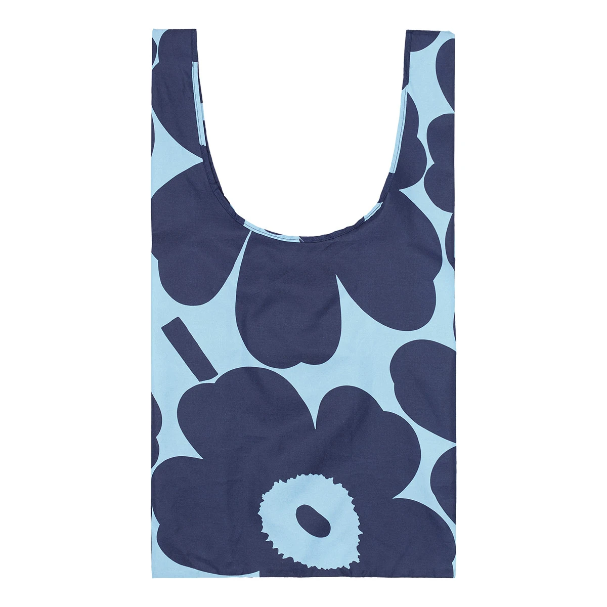 Brighten your day wherever you wander with Maija Isola’s classic poppies (Unikko), here in a joyful dark navy and light blue colorway. Starting off as a cute and convenient square weighing less than a quarter pound, it unfolds into a generous sized tote. This makes it easy to store it in your purse or vehicle until you need it, and will prevent bringing home a plethora of plastic bags when you are out running errands. Fashionable, functional and eco-friendly, the Marimekko Unikko Smartbag will be your little handy helper while on-the-go.