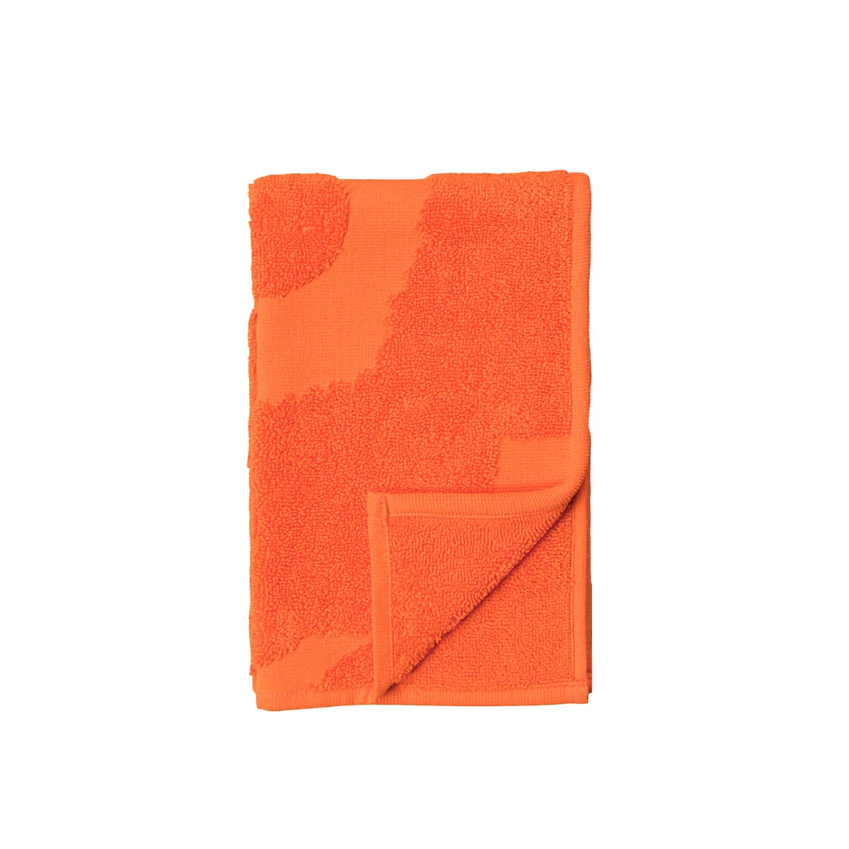 Express your love for Maija Isola’s poppy print in a way that feels soft and subtle. The 1964 Unikko pattern on this generously-sized orange guest towel is revealed purely through the embossment of the petals, stems and centers. This variation in texture does not affect the plush, durable and absorbent quality of the 100% cotton terry composition. A nod to prints but a true solid, this hybrid could be beautifully combined with other Marimekko bath towels, such as Marimekko Nimikko and Ujo, for a unique yet cohesive linen closet.