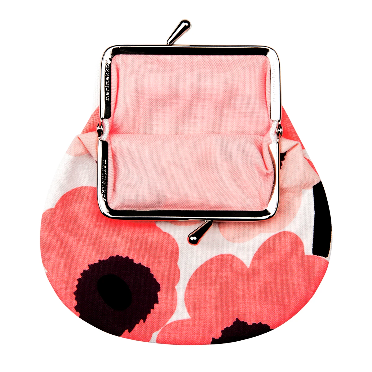 Tuck your treasures in a retro coin purse with Maija Isola’s 1964 poppy print, “Unikko.” The metal clasp opens to reveal a surprisingly roomy pink interior for loose change, cash, cards or cosmetics. Made from 100% cotton, the exterior is printed with Maija Isola’s famous floral pattern “Unikko” in pink, peach, black, and deep plum on a crisp white backdrop. Inside the metal clasp, a pale, peachy pink hue continues.