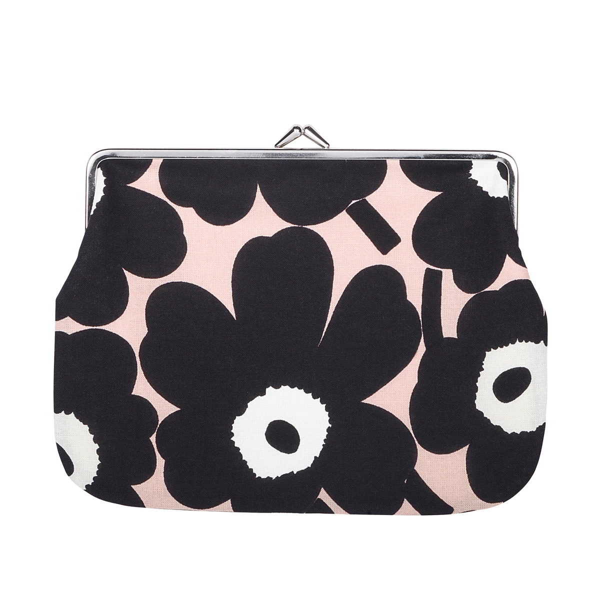 Large enough for cell phones, sunglasses, or snacks, this coin purse is splendidly handy. Cell phones, credit cards, tissues; whatever you keep in this printed pouch, you’ll be able to spot it and retrieve it in a flash. The 100% cotton carrier has a metal clasp that snaps open to reveal a twill lining and snaps shut closed to keep everything secure. Maija Isola’s popular poppy print is contemporary in black on powder pink. Stay cheerily organized with the Marimekko Unikko Powder Pink / Black / White Large Coin Purse.