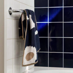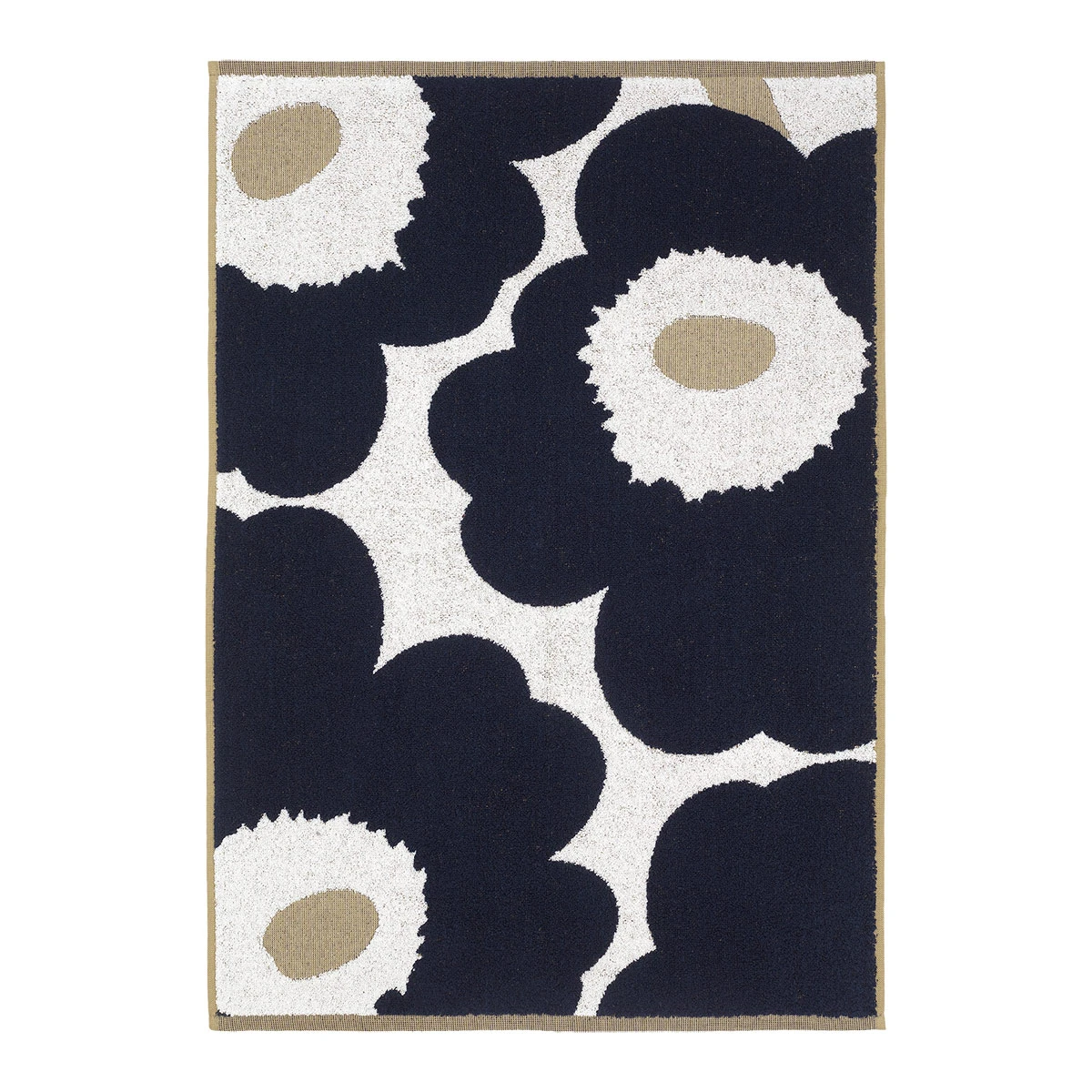 The classic poppies of Maija Isola’s beloved Unikko pattern, meant to symbolize creativity, decorate this joyful Marimekko hand towel in a dark blue, gold and white colorway with reversed colors on the backside. Perfect for setting a fun and lively scene in the bath, this 100% organic cotton terry hand towel is soft, fluffy, absorbent and machine washable when needed. Hang from the attached loop for an effortless display, or fold it over a towel bar for a touch of poppies to brighten your day.